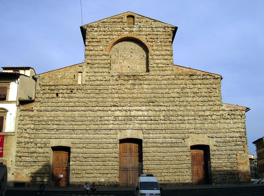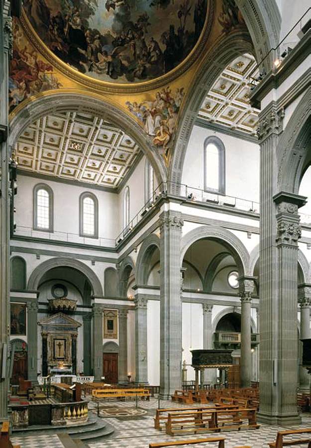 – prxy starej zakrystii stoi nowa zaprojektowana przez Michała Anioła, sklepienie żagielkowe, reszta bruneleschi, motyw łuku triumfalnego w starej zakrystii oraz na planie kwadratu, racjonalizm, plan centralmy mauzoleum (starej zakrystii)/ symetryczna i regularna forma i wnętrze 3 nawowa bazylika z transeptem, z kopuła na krzyżu kościoła strop w nawie głównej z kasetonami, w nawach bocznych sklepienie żagielkowe - element architektoniczny w kształcie wycinka kuli lub elipsoidy służący do przykrywania budowli modułem jest kwadrat powtarzający się w rozplanowaniu i proporcjach przestrzeni wnętrza nawy boczne posiadają przyległe kaplice wnętrze statyczne, doskonale uporządkowane, nawy oddzielone łukami arkadowymi wspartymi na kolumnach lub pilastrach w nawie bocznej zastosowanie ciemnego marmuru w elementach konstrukcyjnych i dekoracyjnych i skontrastowanie z bielą ścian Inspirowana bazylikami wczesnochrześcijańskimi i toskańskim romanizmem np. katedra w Pizie bez fasady