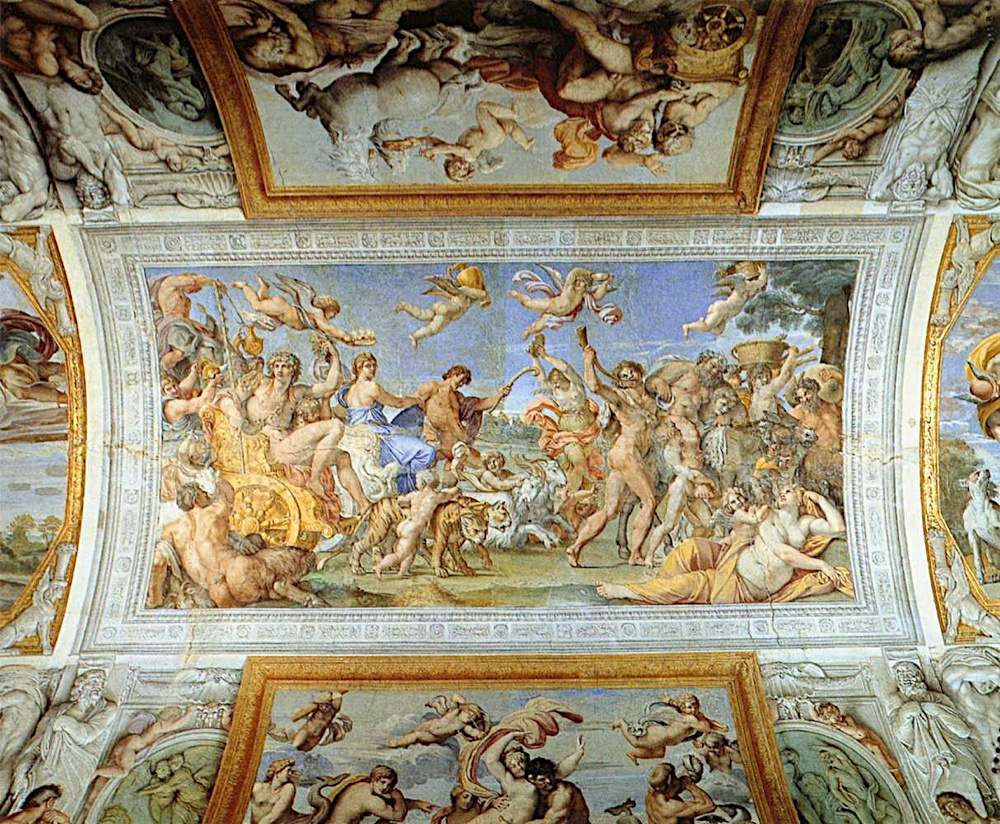 na podstawie ‘Metamorfoz’ Owidiusza temat – potęga miłości bogów greckich - zaczerpnięta z mitologii: Ariadna i Bachus – główna scena, boczne- Galatea i Polifem, Aurora i Kefalos, rozplanowanie kompozycyjne nawiązywało do sklepienia Kaplicy Sykstyńskiej Michała Anioła olbrzymy, nadzy młodzieńcy udające marmury, podtrzymujący medaliony imitujące brąz, obrazy w ramach wydają się przyklejone do sklepienia zabawa architekturą, malarstwem i rzeźbą w doborze tematów miłosnych nawiązują również do dzieła Rafaela Santi (Triumf Galatei, Zaślubiny Amora i Psyche) z tematów miłosnych w willi Farnensina dzieło eklektyczne nawiązujące do przeszłości i wychodzące w przyszłość – cechy barokowe duże znaczenie dla barokowego malarstwa freskowego – następna generacja malarzy włoskich i francuskich triumf Bachusa i Ariadny - największe malowidło na sklepieniu to których otacza orszak roztańczonych bachantek, nimf, z satyrami i uskrzydlonymi puttami, postacie kłębią się na obrazie, bogactwo kolorów i form w złotym rydwanie ciągniętym przez lamparty siedzi Bachus – bóg wina. Na głowie ma opaskę z bluszczu, w ręku swoją laskę. U jego boku – Ariadna w srebrnym rydwanie ciągniętym przez kozły. Putta nakładają jej na głowę diadem z gwiazd, który Bachus rzuci w niebo po jej śmierci, tworząc gwiazdozbiór. Przed nimi orszak weselny satyrów i bachantek – wyznawców Bachusa z tamburynami w ręku. Po prawej stronie pochód otwiera Sylen – mistrz Bachusa. U jego stóp, w prawym dolnym rogu – leży naga kobieta – uosobienie miłości ziemskiej, Ariadna natomiast reprezentuje miłość niebiańską