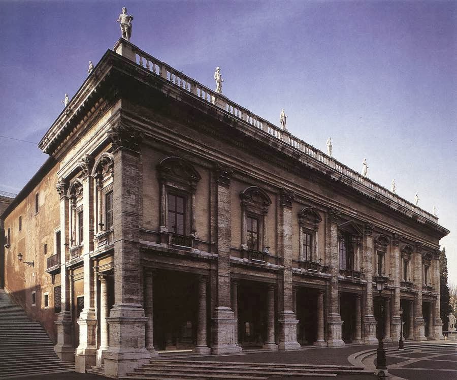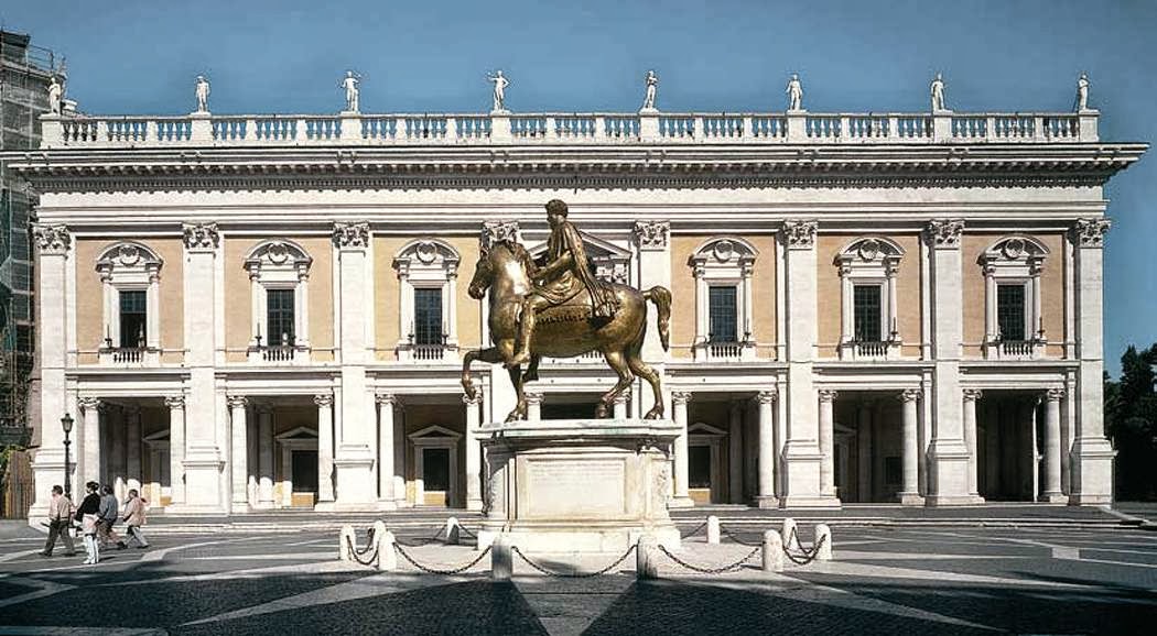 na zlecenia papieża Pawła III stanowi jedno z najdoskonalszych nowoż. rozwiązań urbanistycznych założenie na planie trapezu, którego 3 boki zamykają gmachy: Palazzo Senatorio, Palazzo Nuovo i Palazzo dei Conservatori — ze zbiorami Muzeów Kapitolińskich do podstawy przylegają prowadzące na wzgórze monumentalne schody pośrodku kopia rzym. pomnika konnego Marka Aureliusza. ujednolicane fasady – wielki porządek elipsa w dekoracji bruku