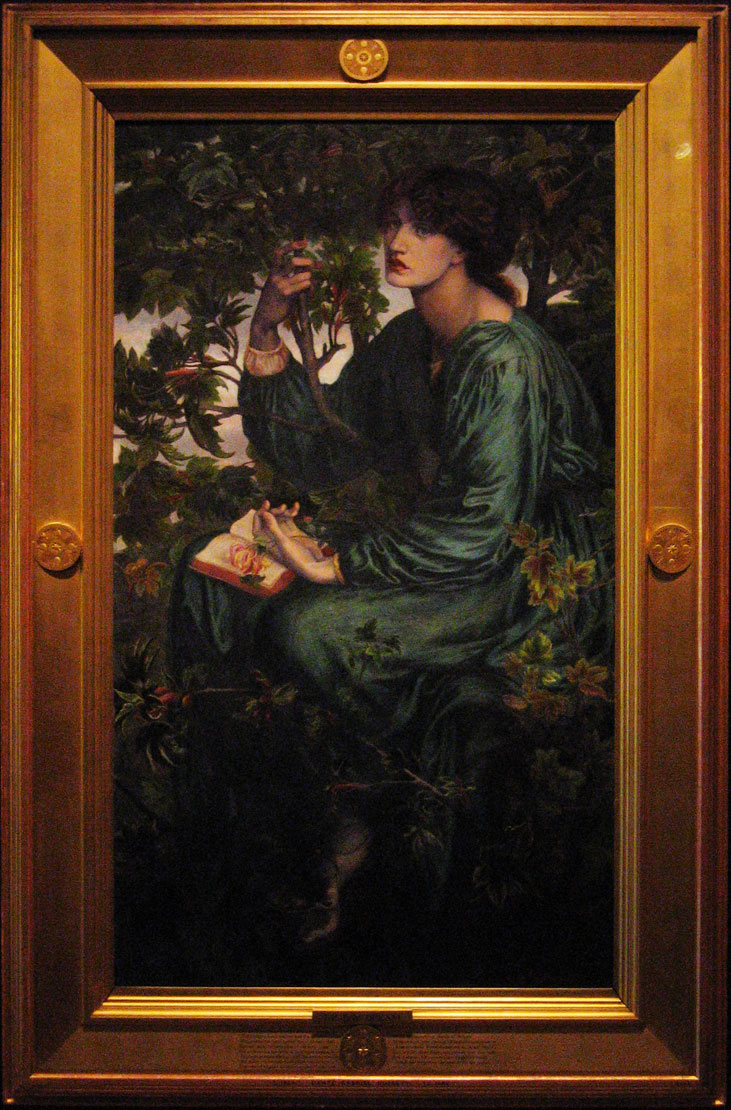 Artysta przedstawił postać pięknej, wyidealizowanej kobiety siedzącej pośród zieleni. Do obrazu pozowała wielokrotna modelka Rossettiego Jane Morriss, żona przyjaciela malarza Williama Morrisa. Parę łączył długi i burzliwy romans, który doprowadził do zerwania przyjaźni pomiędzy artystami. Jane Morriss ukazana została w powłóczystej, zielonej sukni, dzięki czemu jej postać wtapia się w otaczającą roślinność. Jej prawa ręka lekko obejmuje gałąź kwitnącego krzewu, na kolanach ma otwartą książkę, na której trzyma półotwartą dłoń z kwiatem kapryfolium. Kobieta jest zamyślona i melancholijna, robi wrażenie nieobecnej. Obraz ma zwartą i ciasną kompozycję, niemal wszystkie wolne miejsca wypełnione zostały bujną roślinnością. Uzupełnieniem płótna jest masywna rama, na której Rossetti umieścił tabliczkę z sonetem własnego autorstwa, opisującym sen na jawie bohatera tracącego poczucie rzeczywistości.