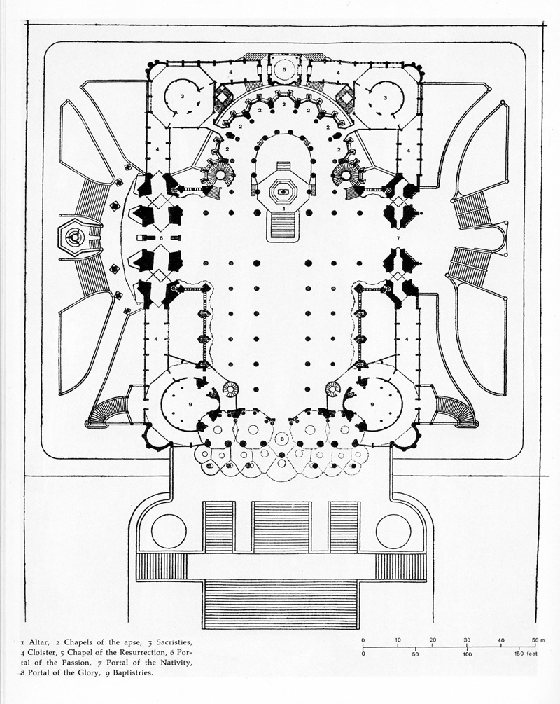 - na planie krzyża greckiego, elementy konstrukcyjne gotyku, / Świątynia zawiera 3 fasady – Narodzenia, Pasji oraz Chwały, każda z nich wybudowana w innym stylu[4]. Zawiera elementy gotyckie, oraz secesyjne. Kościół jest zbudowany na planie krzyża.