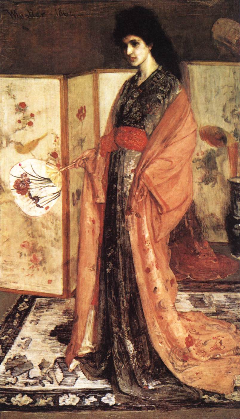Pawia sala – podziały ścian, projektowanie całościowe, dekoracyjność, architektura przestrzeni/ W 1859 James Whistler przeniósł się z Paryża do Londynu, pozostał jednak nadal namiętnym klientem paryskich sklepów, sprzedających w latach 60. XIX w. japońskie i chińskie przedmioty. Artysta kolekcjonował biało-niebieską chińską porcelanę, a w jego przyszłych dziełach miały się zaznaczyć wpływy sztuki chińskiej i japońskiej. Widoczne były one w takich elementach kompozycyjnych jego obrazów jak: parawany, wachlarze, stroje postaci czy ceramika/ Pawi Pokój był początkowo pokojem jadalnym w londyńskim domu Leylanda. W pokoju znajdowała się cenna kolekcja chińskiej porcelany (która stała się pretekstem do tytułu obrazu Whistlera). Wystrój wnętrza zaprojektował architekt Thomas Jeckyll. Aby ukazać w sposób atrakcyjny kolekcję Leylanda Jeckyll skonstruował zestaw misternie rzeźbionych półek, a na ścianach zawiesił zabytkową, pozłacaną skórę[5]. Gdy Leyland stał się właścicielem Księżniczki, obraz zajął eksponowane miejsce nad kominkiem.
