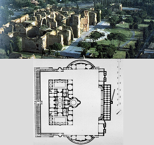 - Budowę term rozpoczęto w 206 roku, za panowania Septymiusza Sewera - Oddano je do użytku za panowania jego następcy Karakalli w 216–217 roku - pierwsze łaźnie publiczne wzniesione w Rzymie od ponad 100 lat, kiedy to otwarte zostały Termy Trajana - Do pomieszczeń prowadziła brama umieszczona pośrodku wschodniego boku. Przez pomieszczenia szatni (apodyterium) przechodziło się do palestry. Pomieszczenia te przeznaczone były między innymi do wykonywania ćwiczeń gimnastycznych. Z nimi sąsiadowały sale masażu, wypoczynku i najprawdopodobniej biblioteki umieszczone w symetrycznie rozmieszczonych apsydach. Za tymi pomieszczeniami, po stronie zachodniej budynku, znajdował się kompleks pomieszczeń ogrzewanych. Były tam m.in. pomieszczenia sauny oraz basen z gorącą wodą (caldarium). Caldarium miało postać okrągłego pomieszczenia, nakrytego kopułą o średnicy 35 metrów[2]. Dalej umieszczono otwarte pomieszczenie sąsiadujące z wewnętrznym patio, na którym umieszczono basen z zimną wodą (frigidarium). Po stronie zachodniej budynku znajdował się plac do rozgrywania zawodów sportowych. Eksedry umieszczone po wschodniej i zachodniej stronie budynku mieściły sale, z których jedna w kształcie ośmiokąta najprawdopodobniej odgrywała rolę nimfeum. Po stronie południowej i północnej wybudowano perystyle i aule zakończone apsydami na dłuższym boku. Wnętrza budowli urozmaicały liczne wnęki i nisze. Ściany i posadzki pokrywały mozaiki oraz malowidła.