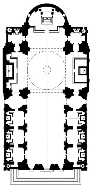 pierwowzór dla wielu kościołów barokowych (nie tylko jezuickich) typ fasady nazywany jest parawanowym monumentalna fasada jest bezwieżowa i dwukondygnacyjna, rozplanowana symetrycznie, z prostotą i powściągliwością, tworząc w efekcie surową, harmonijną całość zwieńczoną trójkątnym przyczółkiem kondygnacje i przyczółek oddzielone są od siebie belkowaniem i uskokowymi gzymsami, tzw. gierowanymi i połączone spływami wolutowymi fasada surowsza, bardziej monumentalna, płaska i horyzontalna typ fasady o zamierzonej oprawie artystycznej - wyróżniająca się z otoczenia, cofnięta od ulicy, wyniesiona za pomocą schodów, co pozwala na jej swobodne oglądanie w planie kościół il Gesù jest zwartą budowlą jednonawową, z transeptem nieznacznie wysuniętym poza korpus i płytkim, prostokątnym prezbiterium zamkniętym apsydą i flankowanym dwoma aneksami do nawy przylegają otwarte ku niej kaplice boczne, podobnie jak do ramion transeptu nawa i kaplice sklepione są kolebkowo, a na skrzyżowaniu nawy i transeptu znajduje się kopuła. Nad kaplicami umieszczono empory dzięki kopule ( na krzyżu kościoła) wschodnia, najważniejsza partia kościoła, była dobrze doświetlona, a rozplanowanie wnętrza zapewniało dobrą akustykę i widoczność z nawy głównej natomiast liczne kaplice boczne służyły do prywatnej modlitwy wiernych 1568-84, początek baroku wczesnego-styl monumentalny i poważny, mało dekoracji-krzyż łaciński, perfekcyjne połączenie formy centralnej z podłużną-inspiracja San Andrea w Mantui Albertiego-konstrukcja ścienno-filarowa, bardzo popularna w baroku-dobrze dostosowany do nowych zasad liturgii-jednonawowy przesklepiony-część centralna(kopułowa) 4 małe kopuły nad kaplicami w narożach-3 przęsłowy korpus, jedna nawa, kaplice po bokach, proporcje 2 kwadratów, krótki i szeroki transept-ołtarz widoczny z każdego miejsca w kościele, dobrze doświetlony, wyniesiony na schody-kaplice z przejściami do odbywania procesji-idea mistycyzmu-> kaplice jako prywatne miejsce do modlitwy -sklepienia kolebkowe na jarzmach z lunetami-luminizm- użycie światła w koncepcji architektonicznej-nad kaplicami empory-czytelnia geometria-rodzaj widowni teatralnej-ruchome dekoracje np. tkaniny na pilastrach-manieryzm: belkowanie prowadzi wzrok do ołtarza, ucieczka przestrzeni-barokowa oś, bo na końcu znajduje się dominantaFASADA:-projekt wczesnobarokowy Giacomo della Porta-pary pilastrów, mocne akordy w rytmie na elewacji-kompozycja osiowa: akcenty zagęszczają się do osi-projektu Vignoli nie zrealizowano, o jednostajnym rytmie i osiowo-symetryczny-mocniejsza część oddzielona szerokim pasem fryzu-subordynacje-dominanta- oś główna( jedna kondygnacja nad drugą, kopuła)-dynamizm-woluty( inspiracja Santa Maria Novella Albertiego)-mało dekoracji, fasada wyeksponowana na plac-fasada parawanowa- nie ma związku z tym co się dzieje we wnętrzu , kościół św Piotra i Pawła w krk sie inspirował na il gesu, kościół jezuitów/ plan: zawężony, przestrzeń jednolita, bo nawa główna zostaje poszerzona, nawiązuje do planu Albertiego, krzyż łaciński z mocno skróconym transeptem, krótkie prezbiterium, długa apsyda z rozbudowanym ołtarzem, kopuła, kościół jednonawowy, po bokach kaplice, centralizacja poprzez kopułę, sklepienie kolebkowe z lunetami, / fasada: monumentalizacja form, spływy wolutowe, oszczędna dekoracja, przypomina bibliotekę laurencjane, hierarchizacja poprzez ułożenie w różnych kondygnacjach, belkowanie, kolumny, zwieńczone przyczółkiem, korynckie pilastry, tympanon, gierowane gzymsy, widoczna oś/ wnętrze: kopuła z bębnem, czasza, latarnia
