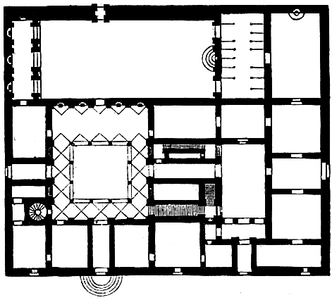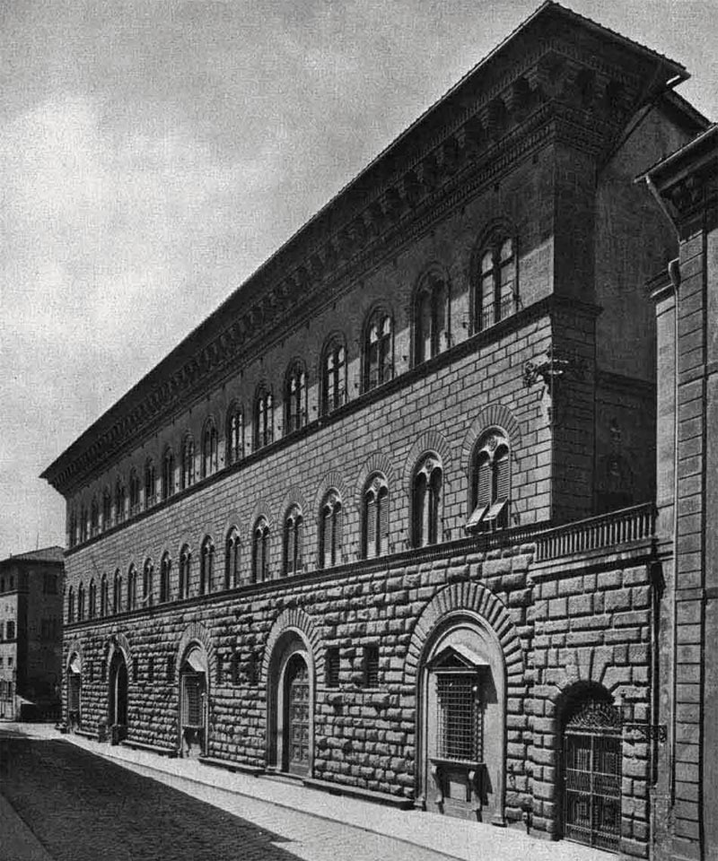 pałac dla Cosmy Medyceusza prototyp toskańskich pałaców renesansowych pałace miejskie renesansowe wywodzą się z włoskiego średniowiecznego domu mieszkalnego - parter ostrołukowe podcienia, o funkcji handlowej, akcentowany portal, i kolejno piętra zamieniono z czasem tę formę na rezydencje miejską 3 piętrową, od góry zamkniętą gzymsem koronującym/ krenelażem , nadano mu charakter obronny niedopracowane proporcje w fasadzie podział horyzontalny fasady na 3 piętra poprzez gzyms im wyżej piętro tym niższe – zaburzenie proporcji gzyms koronujący wewnątrz dziedziniec krużgankowy w kwadracie, loggie okna zamknięte łukiem półkolistym boniowanie fasady boniowanie - dekorowanie lica muru polegające na ścięciu pod kątem lub profilowaniu krawędzi licowych poszczególnych ciosów kamiennych czy płyt (tzw. fazowanie); także imitacje takich ciosów lub płyt w tynku; boniowanie wprowadzano w starożytnej architekturze rzymskiej, popularne od renesansu (głównie we włoskim budownictwie pałacowym)