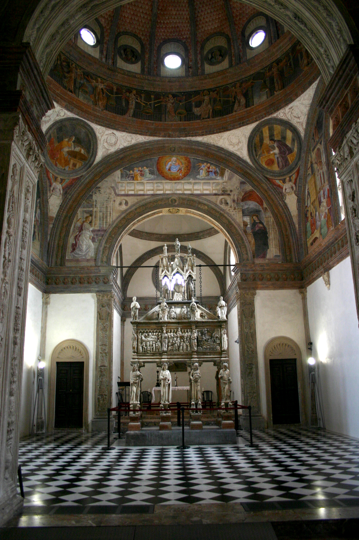 przy kościele S. Eustorgio (1462) w Mediolanie na wzór Kaplicy Pazzich, Rozpoczęty w 1460 roku i ukończony w 1468 roku, został zamówiony przez Pigello Portinariego jako prywatny grób i pomieścił srebrną kapliczkę podarowaną przez arcybiskupa Giovanniego Viscontiego w 1340 roku, zawierającą relikwię głowy św.Piotra z Werony , któremu poświęcono kaplicę. [1] [2] Architekt jest nieznany, tradycyjne przypisanie Michelozzo zostało zastąpione z równą niepewnością przez przypisanie do jednego zFilarete lub Guiniforte Solari , architekt apsydy Certosa di Pavia i kościoła San Pietro in Gessate w Mediolanie.
