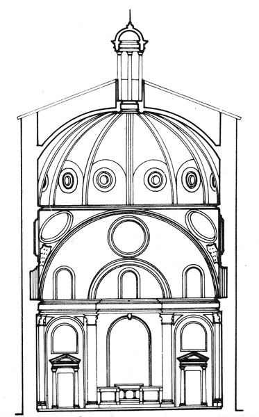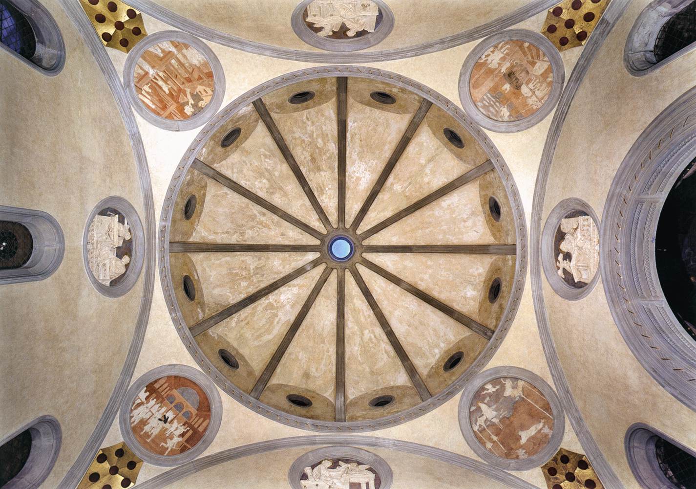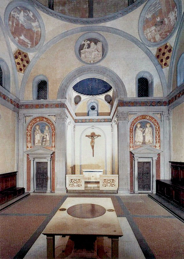 pełniła funkcję kaplicy grobowej Medyceuszy – Piotra i Jana plan centralny, kwadratu, nakryta kopułą na żaglach, bez bębna, z latarnią, czasza kopuły ukryta podział wnętrza 3 dzielne pion – pilastry korynckie, na nich belkowanie i archiwolt otwierająca się mała kopułką – przestrzeń ta stanowi rodzaj prezbiterium zakrystii /kaplicy motyw łuku triumfalnego w organizacji przestrzeni lekkość proporcji, pogodny nastrój wnętrza, jasność konstrukcji podkreślona ciemnym marmurem i bielą ścian, równomierne oświetlenie delikatna dekoracja Donatella
