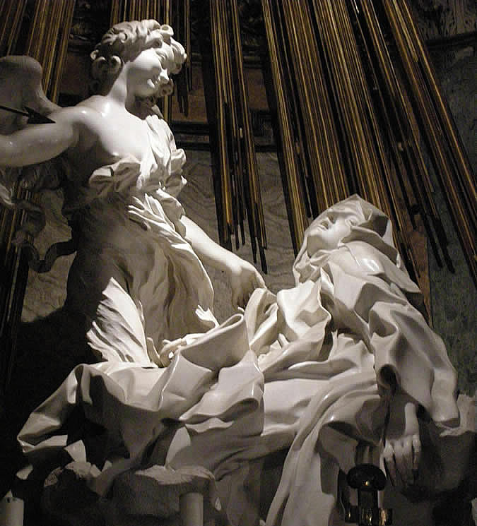 po bokach loże, za parawanem okno, faktura/ Pochodzący z Wenecji kardynał Federico Cornaro zlecił Berniniemu dekorację kaplicy w kościele Santa Maria della Vittoria Była postacią wyjątkową, bowiem do klasztoru karmelitanek, w którym przebywała, wprowadziła regułę pracy. Umartwianie się mniszek niejednokrotnie doprowadzało do śmierci z wycieńczenia, co ostatecznie skłoniło papieża do nakazania złagodzenia reguły klasztornej. Teresa z Avila uważała, że praca fizyczna zbliża do Boga. Proponowała zajmowanie się gospodarstwem, robótki ręczne i prace w obejściu stając się ideałem dla kobiet żyjących w Bogu poświęceniu kaplicy świętej Teresie z Avila. Jej sława dorównywała wówczas patronowi kościoła świętemu Ignacemu z Loyoli. Kaplica umieszczona po lewej stronie transeptu, czyli poprzecznej nawy, została oddzielona jedynie niską balustradą i zbudowana na wzór sceny teatralnej. Bernini, o czym rzadko się mówi, był bowiem także doskonałym kreatorem przedstawień teatralnych. Widownię tej sceny stanowią rzeźby przedstawiające członków rodziny Cornaro umieszczone w lożach poniżej. Bernini zaprojektował kaplicę w najdrobniejszych detalach, obmyślając nie tylko ustawioną na scenie grupę rzeźbiarską, ale także freski na sklepieniu i układ marmurowej posadzki. Ową scenę teatralną tworzy wysunięta do przodu aedicula, inaczej rodzaj niszy wspartej na kolumnach, w której w starożytności umieszczano posągi bóstw. U Berniniego nisza została ujęta w dwie pary kolumn o korynckich głowicach zdobionych liśćmi akantu, czyli popularnego od antyku gatunku ostu, bardzo dekoracyjnego motywu w sztuce. Wsparta naołtarzu ma kształt eliptycznego ośmiokąta i to tam znajduje się grupa rzeźbiarska z główną postacią przedstawiającą świętą Teresę zdecydował o przedstawieniu świętej w momencie niezwykłej wizji, która została opisana przez nią samą i zachowała się do dzisiaj. Cytat: „Zobaczyłam tuż przy sobie, po lewej stronie anioła, zupełnie cielesną postać, jaka zwykle w mych widzeniach się nie ukazywała... Anioł nie był wysoki, owszem, mały, bardzo piękny, a jego oblicze takim jaśniało blaskiem, że musiał należeć do tych aniołów, którzy są całkiem rozpromienieni żarem miłości Boskiej, że musiał być jednym z tych, których zowią serafinami... Widziałam w ręku anioła długi, złoty grot i zdawało mi się, jakoby go utopił po razy kilka w mojem sercu, tak, że czułam, jak żelazo przeszywało mi wnętrzności. A gdy je wyciągnął, zabrał serce moje i pozostawił mnie całkiem płomieniejącą miłością do Boga. Ból był tak wielki, że wydałam okrzyk, ale zarazem uczułam słodycz tak nieskończoną, że nie chciałabym, aby ten ból ustał... Nie był to ból cielesny, lecz duchowy, pomimo, że do pewnego stopnia i na ciało działał. Była to najsłodsza pieszczota, jaką sobie między duszą a Bogiem wystawić można.” Święta Teresa Berniniego unosi się na obłoku. Jej ciało jest niemal w całości okryte mocno udrapowaną tkaniną, z której wysuwają się bezwładnie jedynie lewa ręka i lewa stopa. Głowa odchylona do tyłu i lekko zwrócona w stronę widza; na twarzy o półprzymkniętych oczach i rozchylonych ustach maluje się ekstaza, wielkie oddanie, omdlewające uczucie rozkoszy. Całe ciało, mimo że niewidoczne pod silnie pofałdowaną szatą zwraca się w stronę strzały wymierzonej przez stojącego z lewej strony anioła. Anioł rzeczywiście jest niewielki, jak w wizji świętej, okryty tkaniną, która swobodnie faluje, bowiem strzała trzymana w prawej ręce kilkakrotnie uderzała w ciało mniszki; możemy domyślać się tego ruchu po sposobie ułożenia anielskiej szaty obnażającej prawy bark, rękę i pierś anioła. Lewą ręką trzyma habit mniszki, by dokładnie wycelować grotem w jej serce. Rzeźba jest w całości wykonana z białego marmuru, który oświetlony podwójnie - poprzez światło rzeczywiste padające z ukrytego nad sceną okna oraz przez promienie słoneczne wykonane ze złoconego brązu i oddające refleksy - wydobywa pewną malarskość przedstawienia Głębokość żłobień wydobywa cienie z marmurowej powierzchni. Szczególnie ten rozkwit barw wywołany światłocieniem widać w szatach świętej Teresy i serafina – utraciły one swoją materialność Ekstaza świętej Teresy wywoływało skrajne emocje. Artyści chętnie powielali motyw pofałdowanych draperii by ukazać ruch ciała i wydobyć światłocień z rzeźb. Także obłoki pełne puttów – małych aniołków stały się popularnym w baroku w okresie rokoka motywem rzeźbiarskim