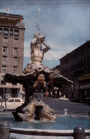 siedzi na muszli podpieranej przez delfiny (?)/ rzeźba została wkomponowana w plac w czasie przebudowy zleconej przez papieża Urbana VIII przedstawia greckie bóstwo morskie, Trytona, syna boga mórz Posejdona w podstawie fontanny znajdują się podobizny delfinów, których podniesione ogony utrzymują muszlę, na której umieszczona jest postać samego Trytona, z trzymanego przez niego rogu wypływa strumień wody