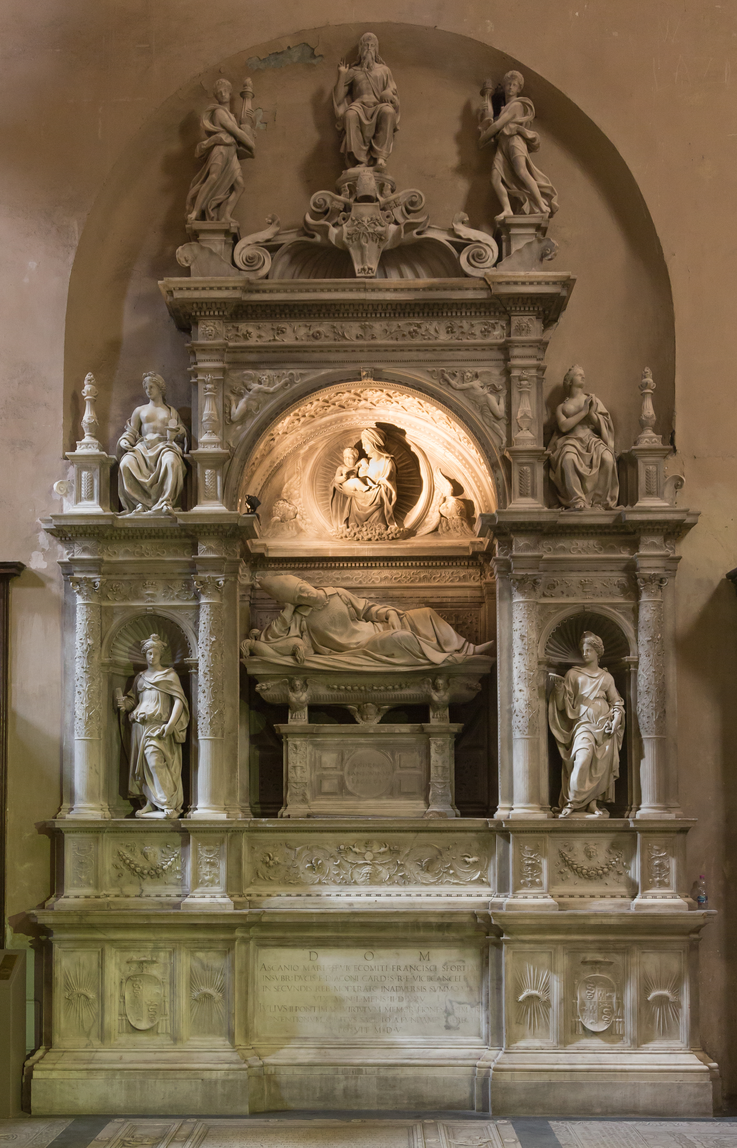 nagrobki w formie łuku tryumfalnego zainspirowane zostały architekturą Bramantego przyścienne nagrobki forma potrójnej arkady łuku triumfalnego, centralna półkolista nisza ze sarkofagiem i postacią zmarłego nisze boczne, elementy oddzielone półkolumnami całość umiejscowiona na wysokim podwójnym cokole ozdobiona posągami alegorycznymi cnót i bogatą dekoracją np. kandelabrową wsparta postać zmarłego śpiąca, zeświecczenie tematu zmarłego, nacisk na radość życia doczesnego (inspiracja nagrobkami etruskimi)