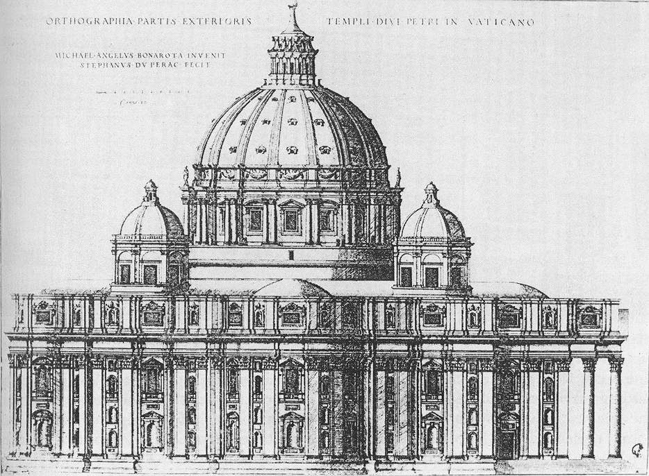 • plan i kopuła Bazyliki św. Piotra zanim Michał Anioł, na polecenie papieża Pawła III, w 1546 roku przystąpił do prac nad bazyliką, świątynia powstawała już od roku 1506, a z pracami nad nią związane były tak wybitne osobowości włoskiej architektury, jak Donato Bramante, Giuliano da Sangallo, Rafael Santi, Baldassare Peruzzi i Antonio da Sangallo młodszy prace nad bazyliką trwały bardzo długo, świątynia została konsekrowana dopiero w 1629 roku. Michał Anioł powrócił do pierwotnej koncepcji Bramantego, którą określił jako „klarowną, czystą (tzn. pozbawioną nadmiaru dekoracji) i pełną światła”. Wszystkie wprowadzone przez niego zmiany prowadziły w stronę unifikacji i centralizacji bryły świątyni, tak by zatrzeć wprowadzane w międzyczasie elementy, mające nadać jej plan bazyliki podłużnej znacznie pogrubił mury świątyni i filary dźwigające kopułę, zwęził nawy i zmniejszył kaplice. Dla całej bryły budynku najistotniejsze znaczenie mają zmiany, jakie wprowadził w koncepcji kopuły. Artysta zmienił jej rozpiętość – ma ona 42 metry średnicy i 132 metry wysokości licząc od posadzki – dzięki czemu stała się ona akcentem dominującym, podkreślającym środek świątyni, gdzie, jak głosi tradycja, znajdować ma się grób św. Piotra projekt kopuły został sporządzony w 1547 roku. Punktem odniesienia była dla architekta nie kopuła Panteonu a kopuła katedry Santa Maria del Fiore we Florencji zaprojektowana przez Filippo Brunelleschiego zachowało się kilka rysunków Michała Anioła i wykonany na potrzeby budowy drewniany model kopuły. Za życia artysty (zmarł w 1564 roku) zdołano zrealizować jedynie bęben. Konstrukcja została ukończona w latach 1585–1590 pod nadzorem architektów Giacomo della Porta i Domenico Fontany.