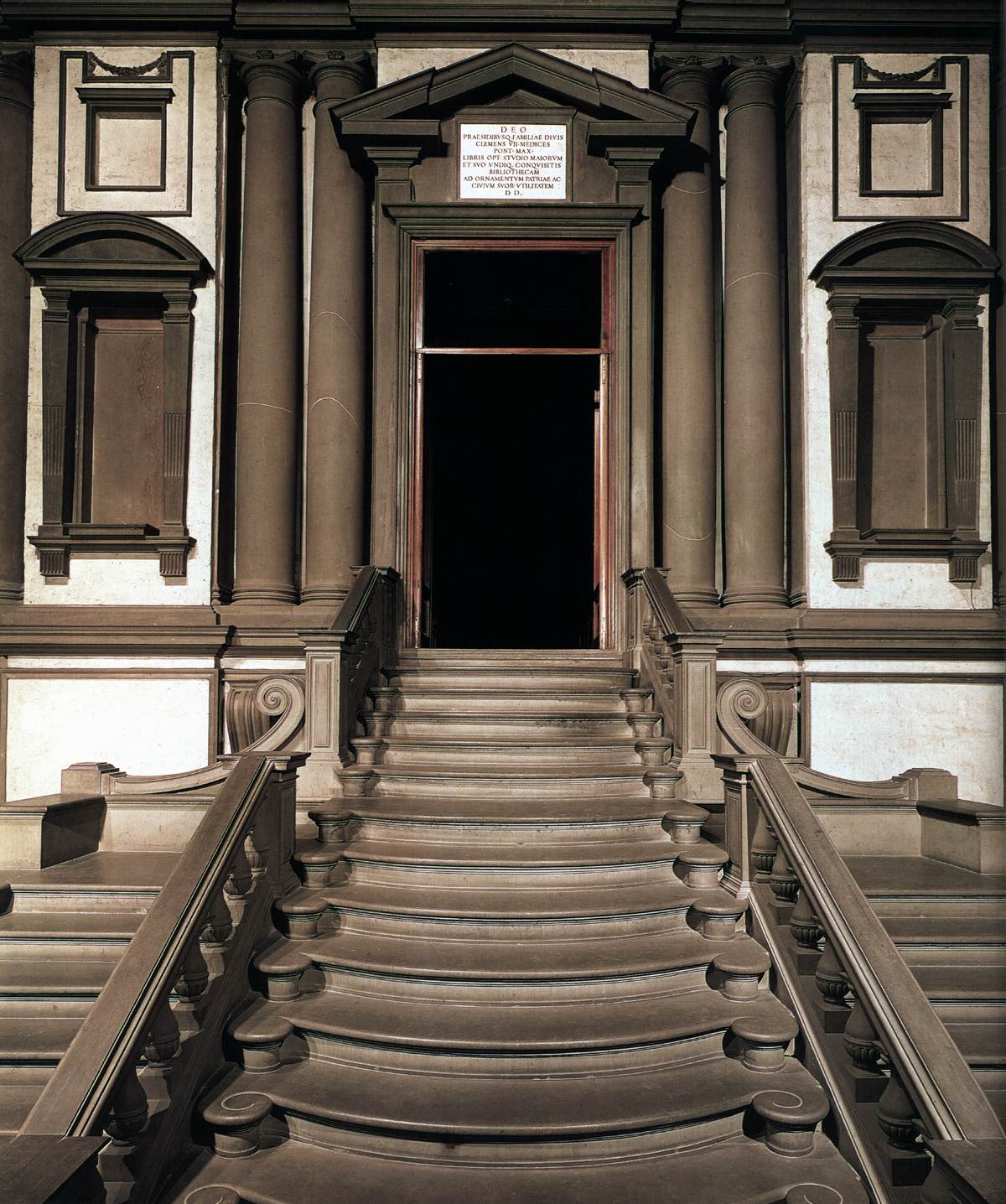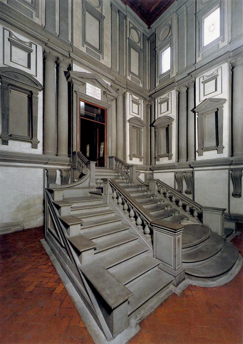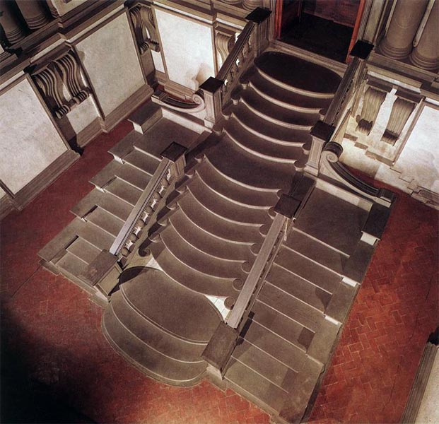 praca zlecona przez papieża Klemensa VII klatka schodowa prowadząca do czytelni jest prawdziwym arcydziełem architektury iluzjonistycznej. nowości – trójkątny przyczółek nad drzwiami z przerywaną podstawą, kolumna nie jako konstrukcja, ale dekoracja, okna ustawione ciasno stopnie środkowego szeregu schodów są zaokrąglone i różnią się szerokością – trzy najniższe stopnie są znacznie szersze od pozostałych dwa boczne szeregi schodów mają proste stopnie tej samej szerokości. stopnie schodów wylewają się miękko, po liniach falistych tralki i konstrukcja oparć jest masywna ciężka brak ornamentyki afunkcjonalność form zapowiadające manieryzm i barok