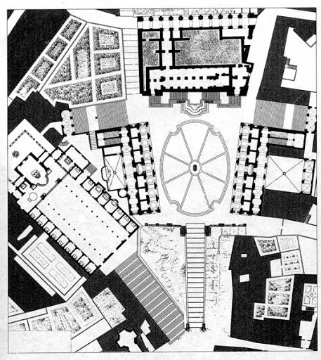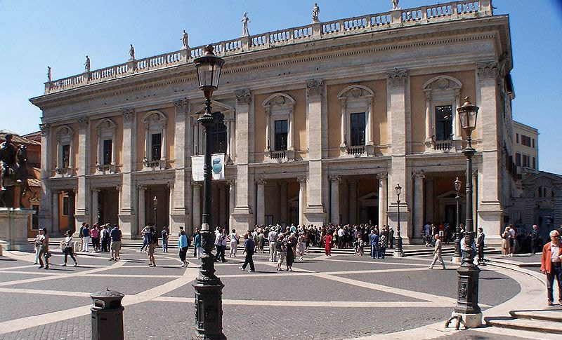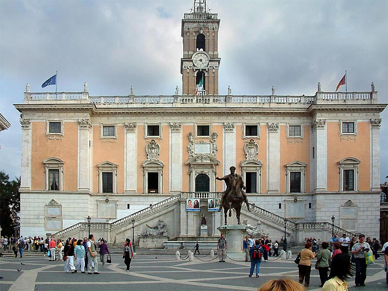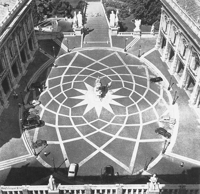na zlecenia papieża Pawła III stanowi jedno z najdoskonalszych nowoż. rozwiązań urbanistycznych założenie na planie trapezu, którego 3 boki zamykają gmachy: Palazzo Senatorio, Palazzo Nuovo i Palazzo dei Conservatori — ze zbiorami Muzeów Kapitolińskich do podstawy przylegają prowadzące na wzgórze monumentalne schody pośrodku kopia rzym. pomnika konnego Marka Aureliusza. ujednolicane fasady – wielki porządek elipsa w dekoracji bruku
