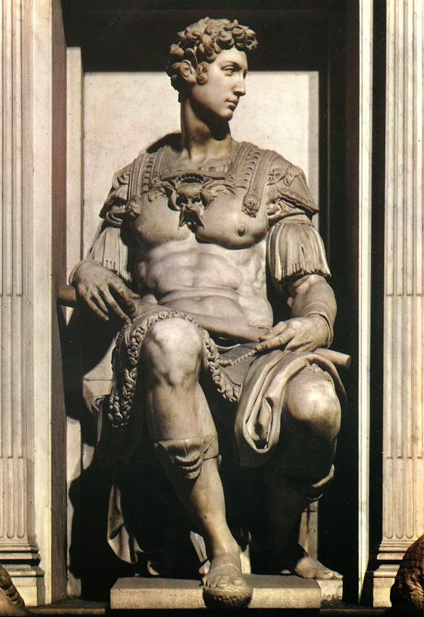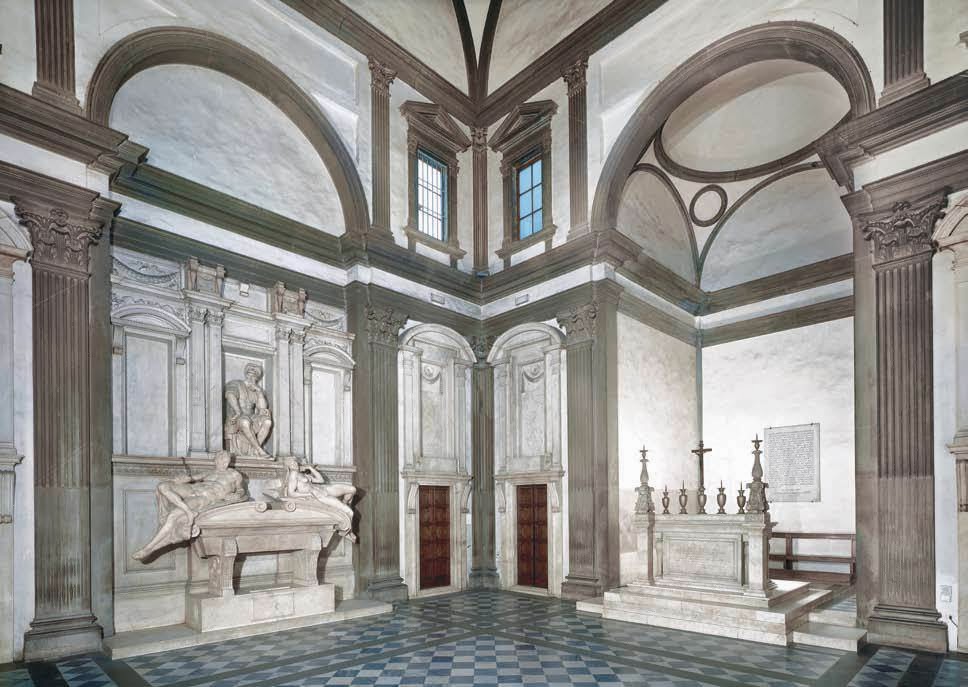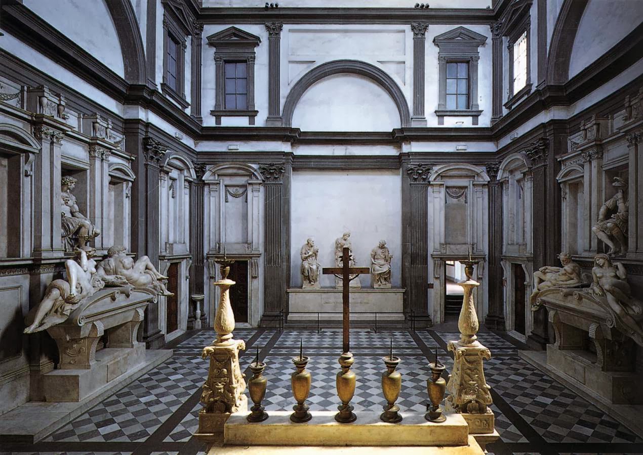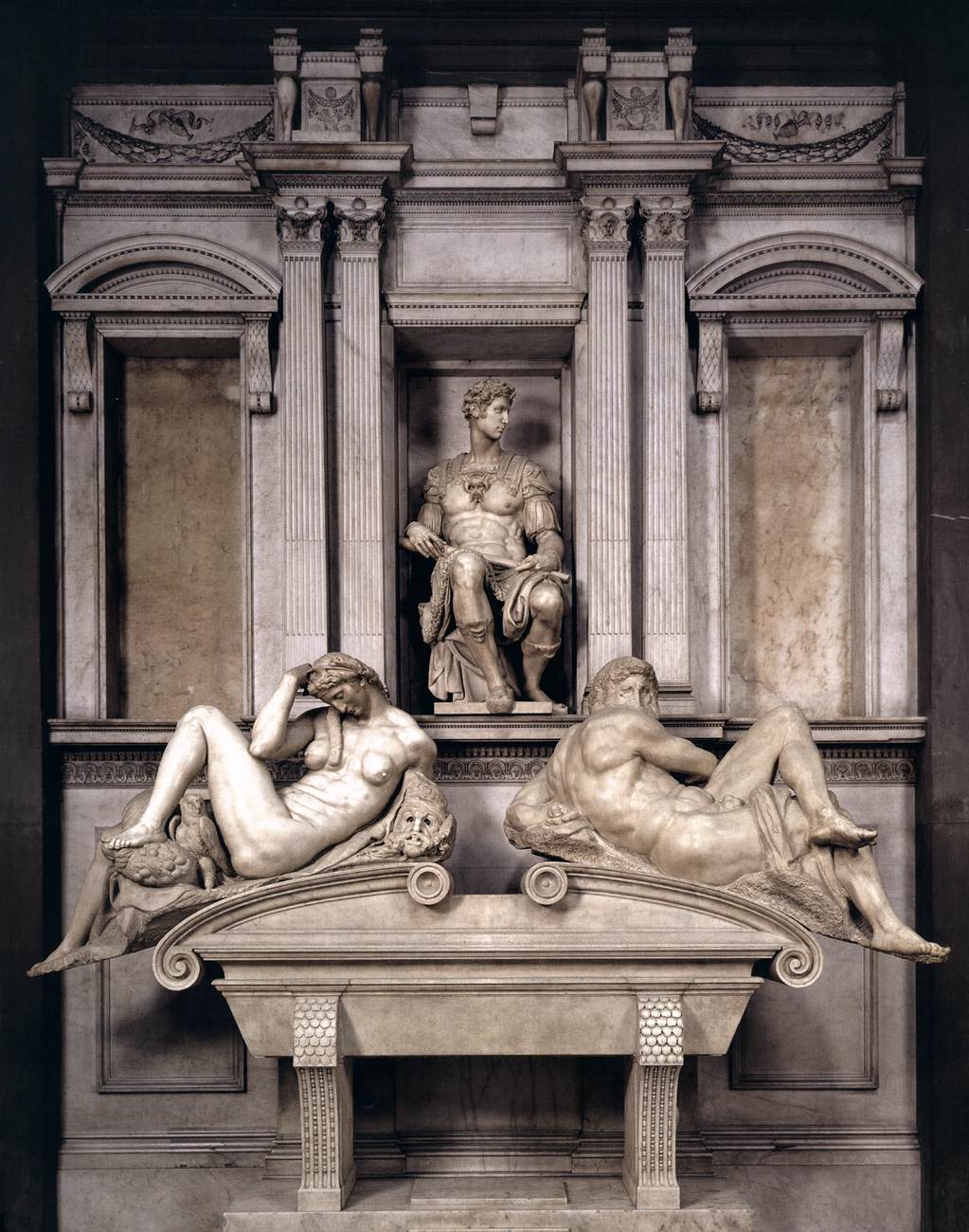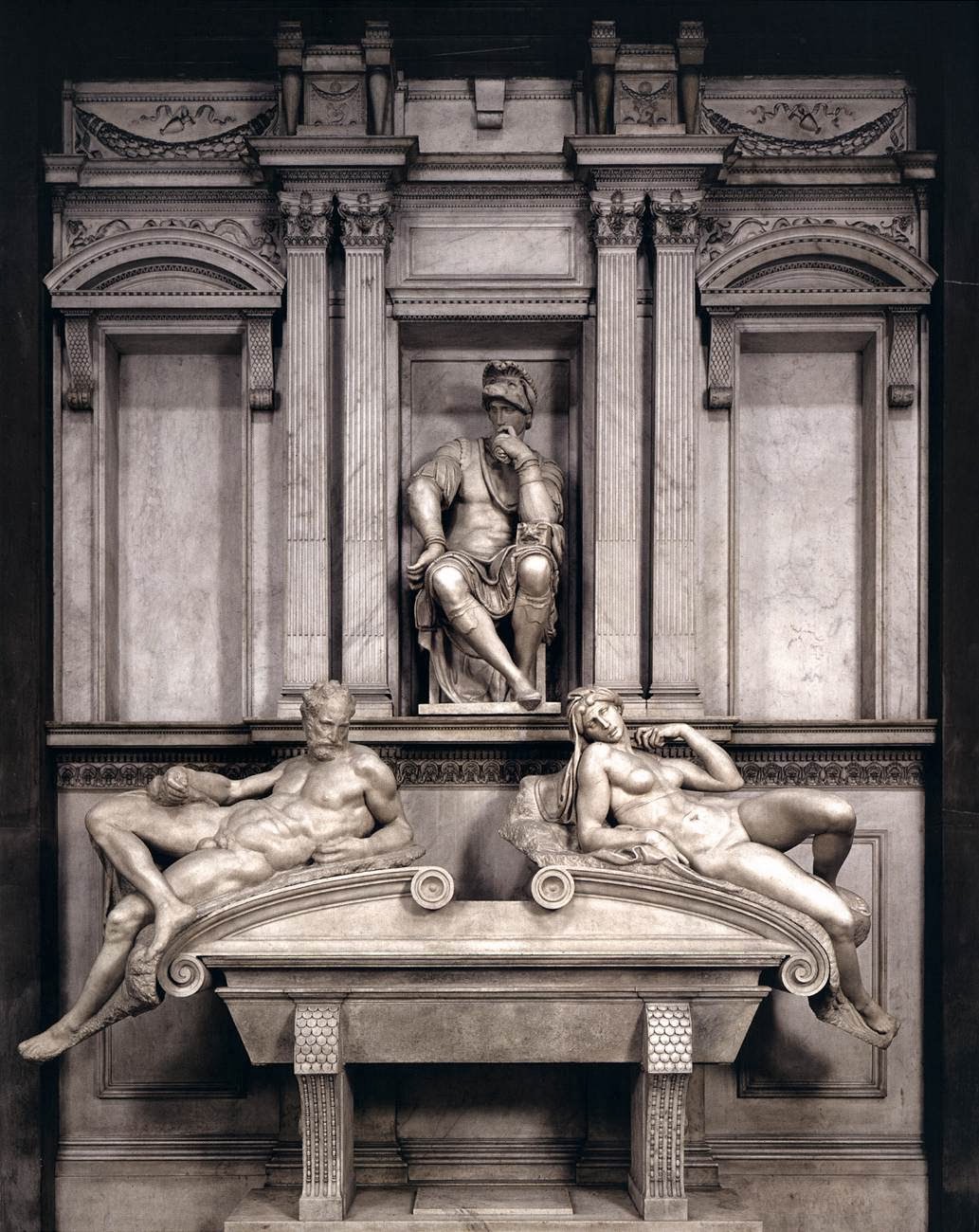 kaplica Medyceuszów Nowa Zakrystia zamówiona przez papieża Klemensa VII (pochodzącego z rodu Medyceuszy) w założeniu miały być cztery, ale projektu nie zrealizowano i zostały dwa. Nigdy nie wykonane dwa miały być poświęcone Wawrzyńcowi Wspaniałemu (1449-1492) i jego bratu Giuliano (1453-1478). stanowi formę mauzoleum jej pierwszym architektem był Michał Anioł zaś budowę ukończył Giorgio Vasari w roku 1557. znajdują się w niej nagrobki Wawrzyńca Medyceusza (księcia Urbino), wraz z rzeźbami "Poranka" i "Zmierzchu", oraz Juliusza Medyceusza z rzeźbami "Dnia" i "Nocy" w obu przypadkach rzeźbiona postać zmarłego siedzi w prostokątnej niszy - Odnośnie Juliana i Wawrzyńca wysuwa się hipotezy, że ich postacie symbolizują dwa modele życia: czynne i kontemplacyjne; poniżej zaś na tumbie leżą dwie kolejne postacie – mężczyzna i kobieta. Owe leżące postacie to personifikacje: na jednym nagrobku są to Świt i Zmierzch, na drugim zaś Dzień i Noc – razem zatem tworzą cztery pory doby i symbolizują upływający czas. architektura podporządkowana rzeźbie – nowość wieloplanowość kompozycji, efekty perspektywiczne I plan sarkofagi z postaciami alegorycznymi II plan ściana ze zmarłym, oprawa architektoniczna symetryczna ułożenie postaci alegorycznych na sarkofagach, postacie te opłakują zmarłych w ich ukształtowaniu formalnym dominuje niepokój, ruch, dynamika, akty postacie zmarłych pokazane jako żywe, siedzące, w układzie rotacyjnym