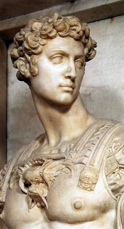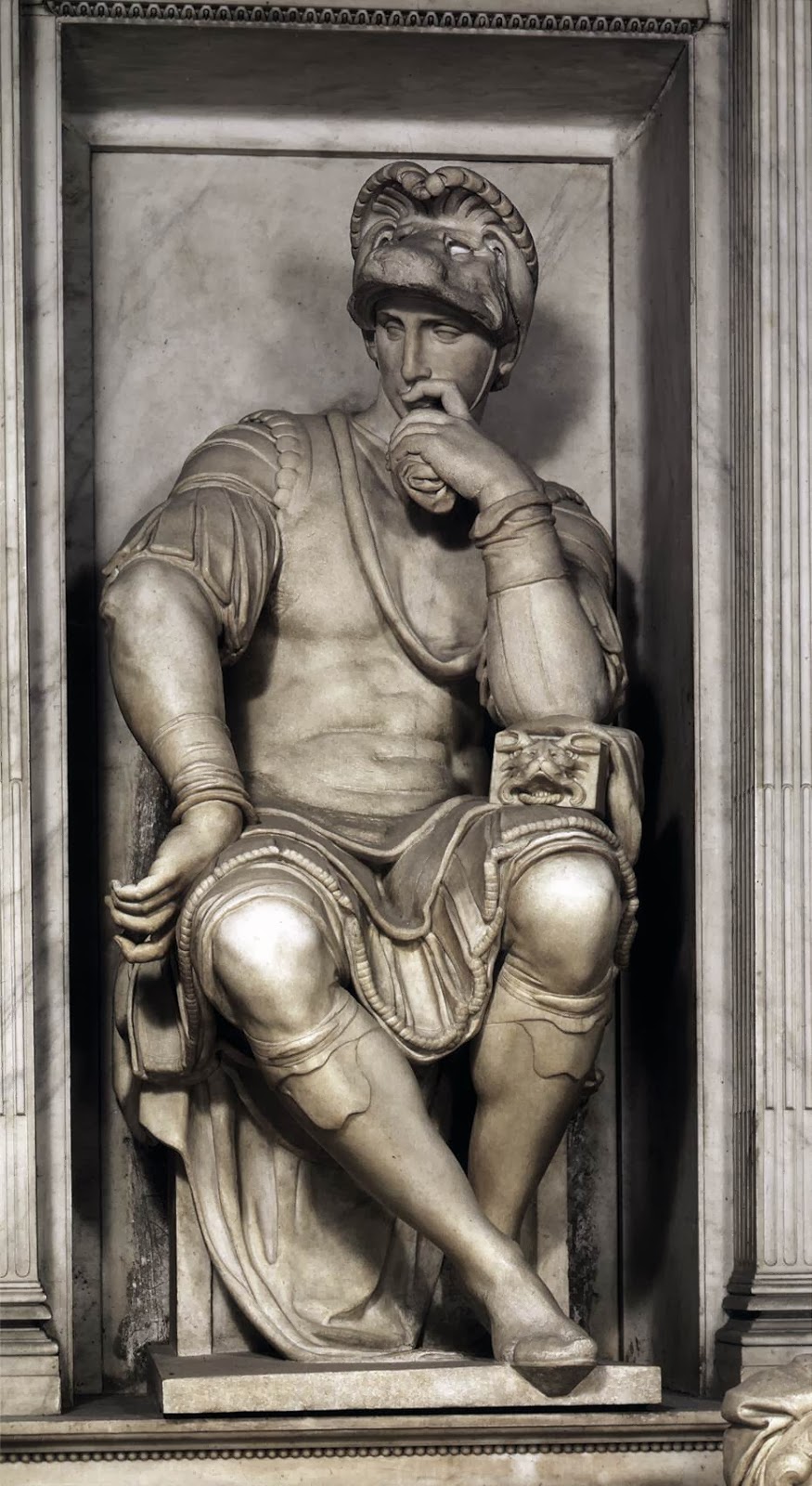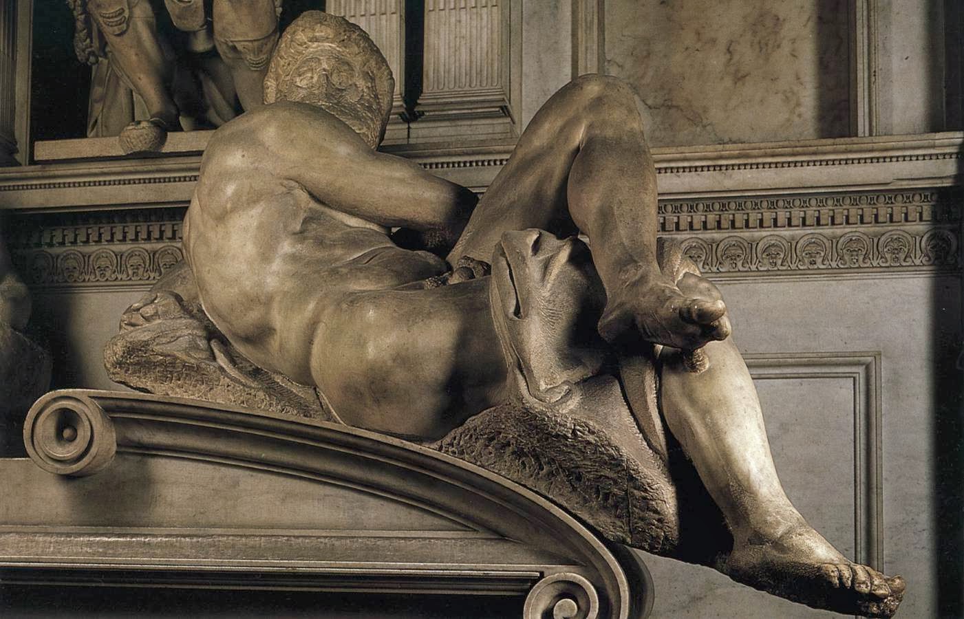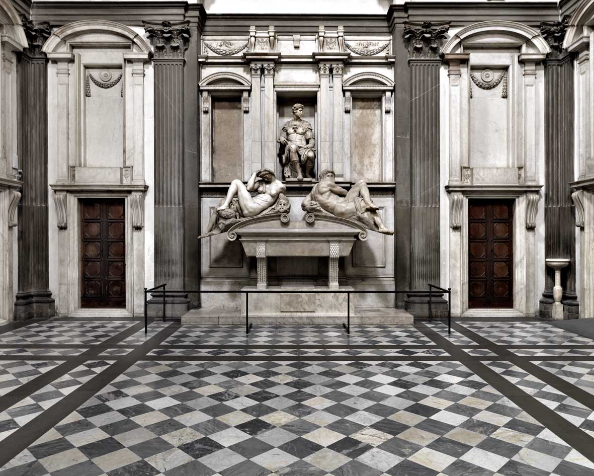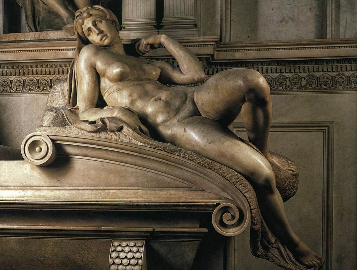 kaplica Medyceuszów Nowa Zakrystia zamówiona przez papieża Klemensa VII (pochodzącego z rodu Medyceuszy) w założeniu miały być cztery, ale projektu nie zrealizowano i zostały dwa. Nigdy nie wykonane dwa miały być poświęcone Wawrzyńcowi Wspaniałemu (1449-1492) i jego bratu Giuliano (1453-1478). stanowi formę mauzoleum jej pierwszym architektem był Michał Anioł zaś budowę ukończył Giorgio Vasari w roku 1557. znajdują się w niej nagrobki Wawrzyńca Medyceusza (księcia Urbino), wraz z rzeźbami "Poranka" i "Zmierzchu", oraz Juliusza Medyceusza z rzeźbami "Dnia" i "Nocy" w obu przypadkach rzeźbiona postać zmarłego siedzi w prostokątnej niszy - Odnośnie Juliana i Wawrzyńca wysuwa się hipotezy, że ich postacie symbolizują dwa modele życia: czynne i kontemplacyjne; poniżej zaś na tumbie leżą dwie kolejne postacie – mężczyzna i kobieta. Owe leżące postacie to personifikacje: na jednym nagrobku są to Świt i Zmierzch, na drugim zaś Dzień i Noc – razem zatem tworzą cztery pory doby i symbolizują upływający czas. architektura podporządkowana rzeźbie – nowość wieloplanowość kompozycji, efekty perspektywiczne I plan sarkofagi z postaciami alegorycznymi II plan ściana ze zmarłym, oprawa architektoniczna symetryczna ułożenie postaci alegorycznych na sarkofagach, postacie te opłakują zmarłych w ich ukształtowaniu formalnym dominuje niepokój, ruch, dynamika, akty postacie zmarłych pokazane jako żywe, siedzące, w układzie rotacyjnym