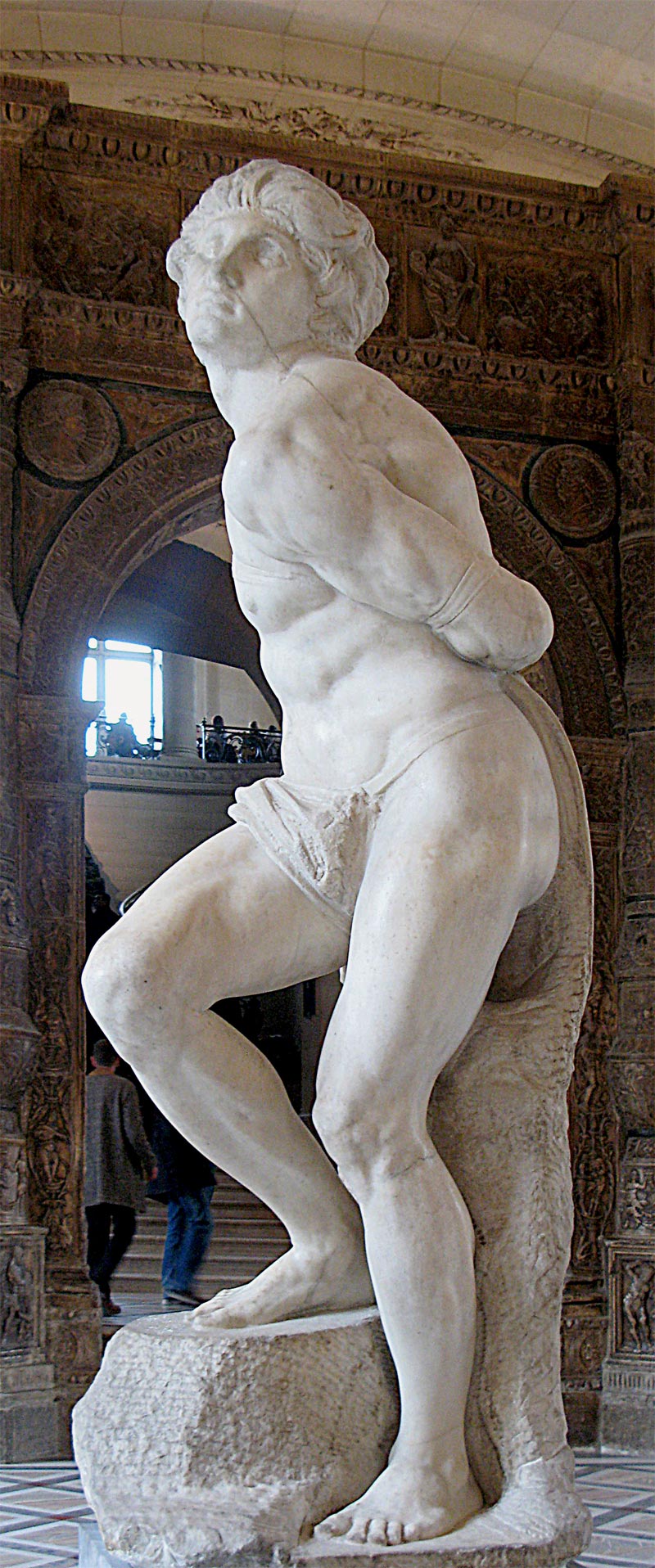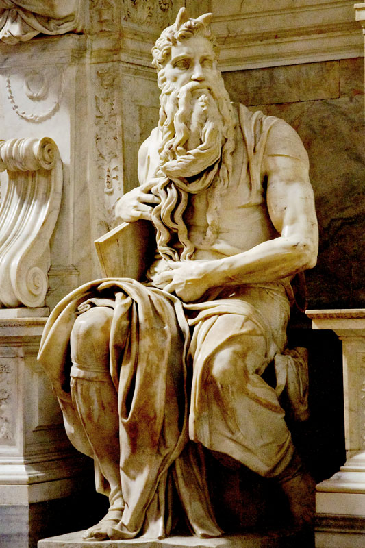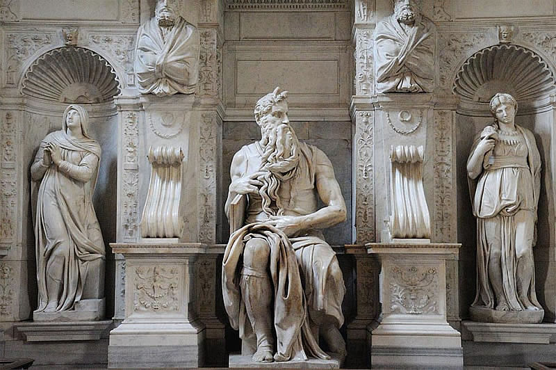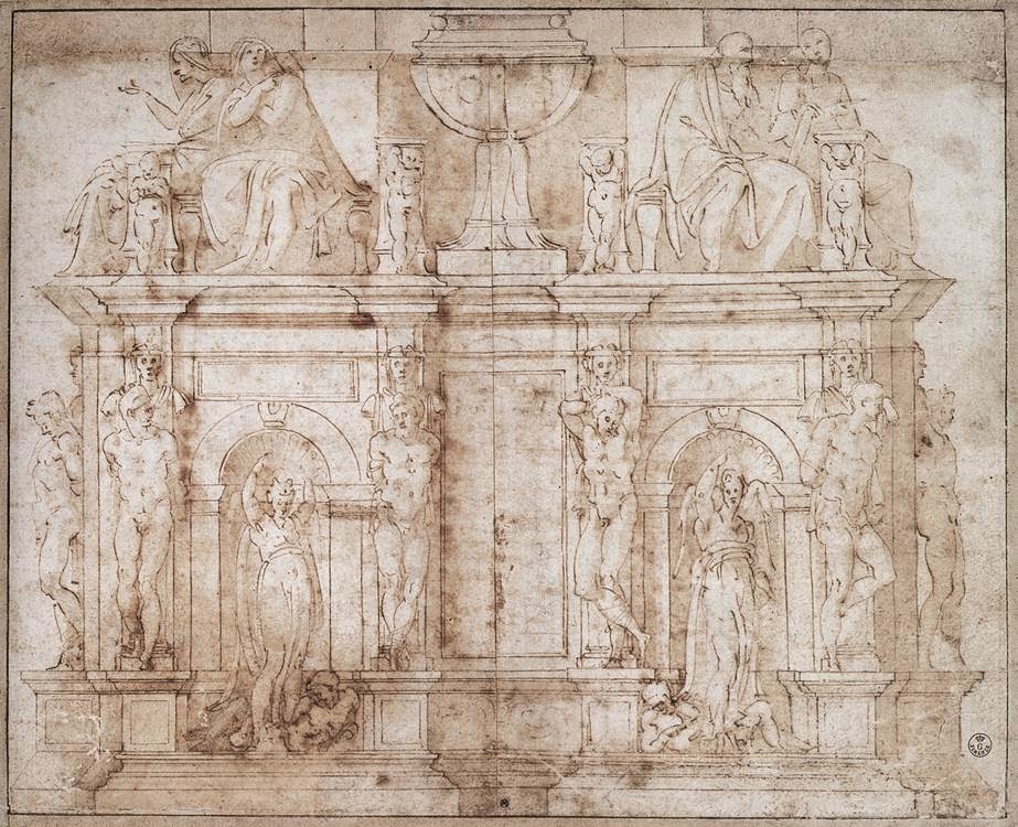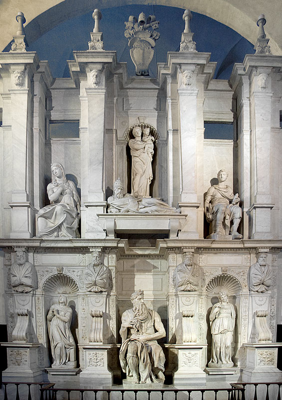 w zamyśle Buonarrotiego nagrobek miał być czymś w rodzaju wolnostojącego mauzoleum, ostatecznie stał się nagrobkiem przyściennym - oprawa architektoniczna ze zredukowaną liczbą posągów planowany do bazyliki św. Piotra w Watykanie, postać Mojżesza - potężny mężczyzna, u którego wszystko jest wielkie: atletyczna sylwetka, splątana broda, dłonie, szeroka twarz, ogromna postać Mojżesza ma być fizycznym przejawem wielkości jego ducha, jego wiary, ale też gniewu i pychy. Mojżesz i Jozue wracają do obozu Izraelitów. Prorok patrzy na lud wybrany pląsający wokół złotego bożka i wzbiera gniewem. Moment uchwycony przez Michała Anioła to moment tuż przed tym, jak Mojżesz chwyta tablice, unosi je nad głową i roztrzaskuje na drobne kawałki. Jeszcze siedzi, ale jedną nogę cofnął, tak jak wtedy, gdy chcemy się poderwać z siedzenia. Pochyla potężny tors do przodu, wciąż jeszcze przeczesuje brodę, niby z roztargnieniem, ale wzrok ma wbity w niewierny tłum. Za chwilę zerwie się z siedzenia, rozbije tablice otrzymane od Boga, ukaże lekkomyślny lud. Spali złotego cielca. A potem na nowo zawrze przymierze z Bogiem, w imieniu tych wszystkich, którzy mu się sprzeniewierzyli. znane są trzy projekty grobowca – czworoboczny budynek z 40 naturalnej wielkości posągami (marmur, brąż) ostateczny kształt architektoniczny oraz wystrój rzeźbiarski ustalony został już po śmierci papieża Juliusza II z jego spadkobiercami. Michał Anioł wykonał jedynie posąg Mojżesza; inne figury jego autorstwa, Geniusz zwycięstwa (alegoria zwycięstwa) i dwie figury tzw. Jeńców (alegorie prowincji podbitych przez Juliusza II, jeden pełen rezygnacji, drugi próbuje uwolnić się z więzów), obecnie w Luwrze i Florencji, nie zostały włączone ostatecznie do nagrobka. figury Lei i Racheli (alegoria życia czynnego i kontemplacyjnego) nie są dziełem Michała Anioła – zostały przez niego zlecone. figura papieża na katafalku została wykonana przez innego rzeźbiarza, bez związku z Michałem Aniołem.