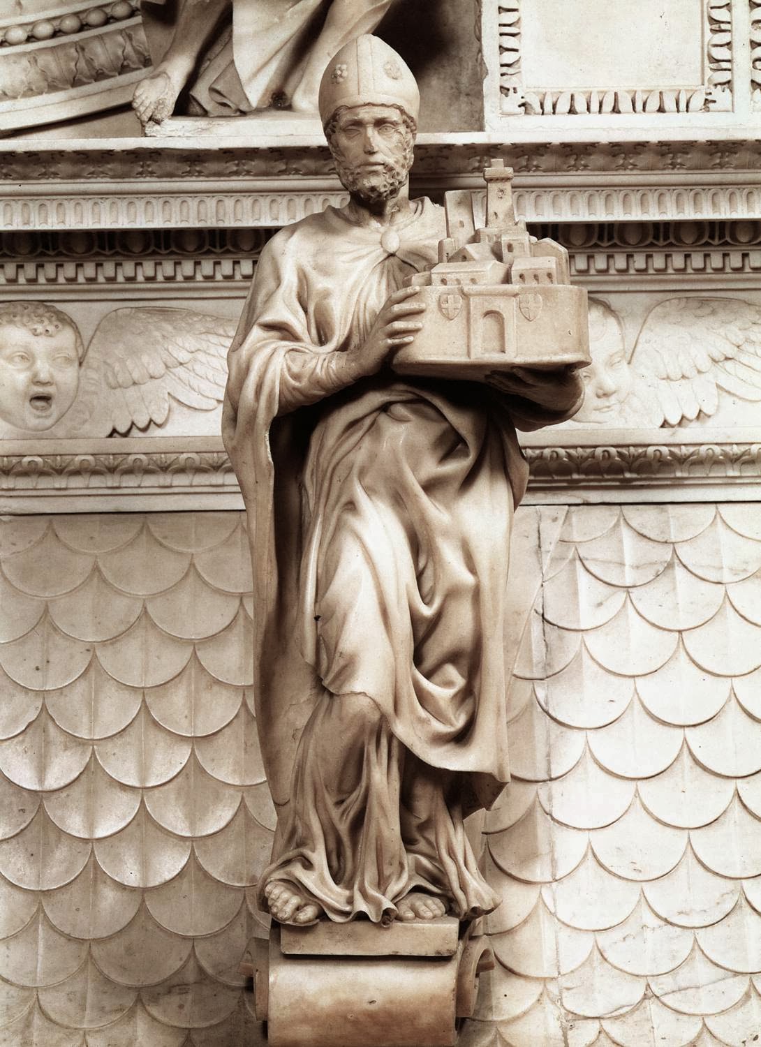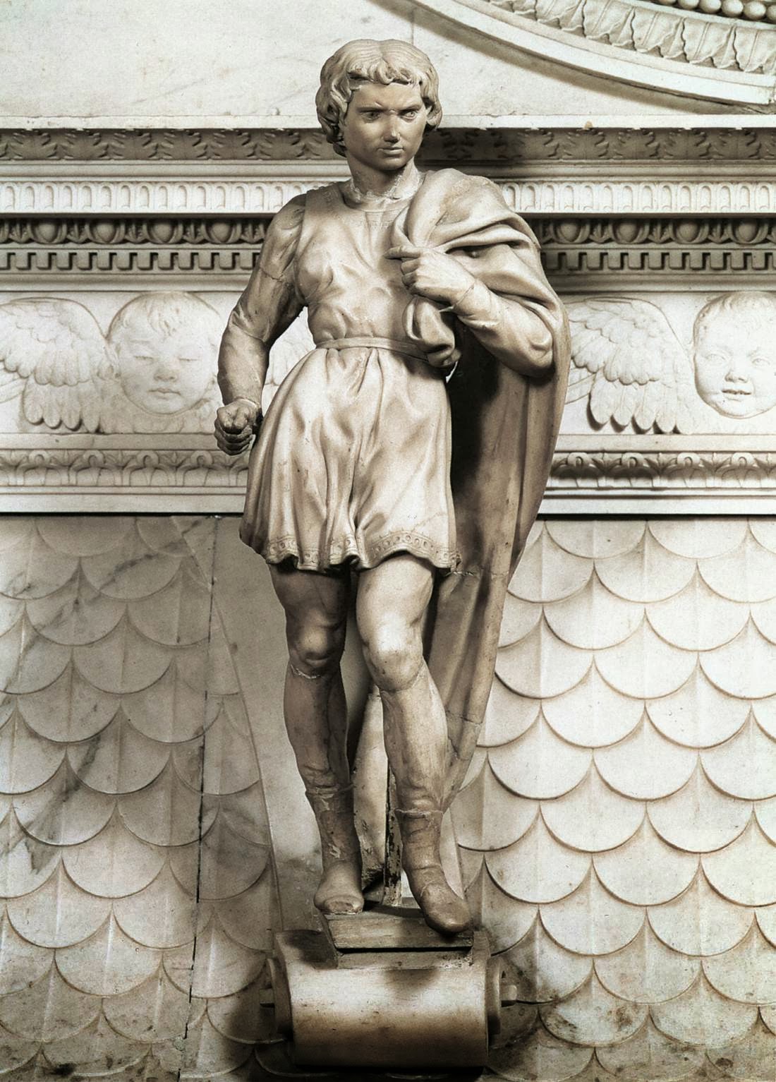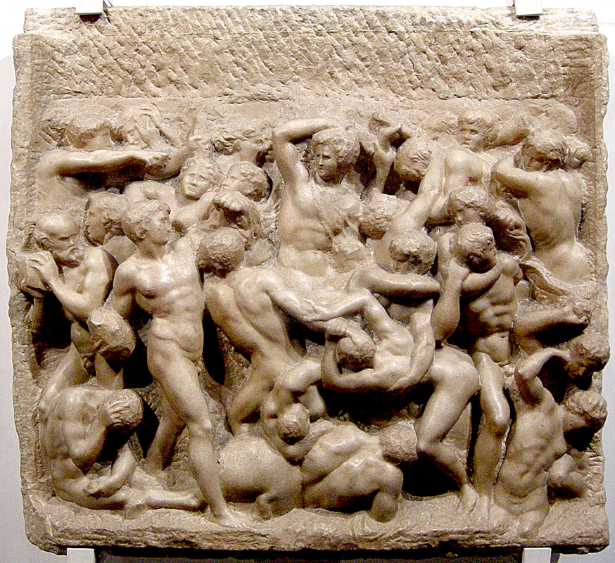św Prokulus, petroniusz, centauromachia, madonna na schodach, anioł z kandelabrem, • Walka centaurów z Lapitami i Madonna przy schodach (1489–92 — obie w Casa Buonarotti, Florencja) najwcześniejsze prace artysty — płaskorzeźby wpływ antycznych rzeźb