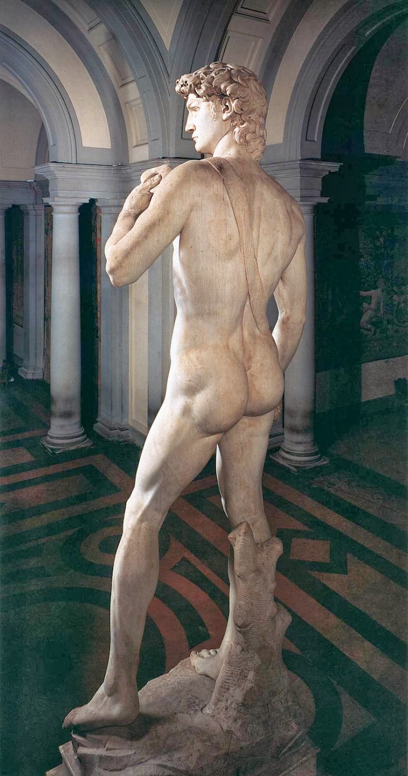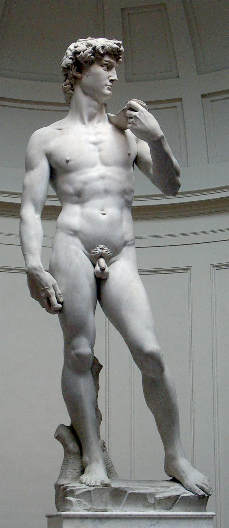 marmur, jest jednym z ważniejszych dzieł Michała Anioła. To nie tylko arcydzieło estetyczne i dowód na doskonałą technikę artysty, ale przede wszystkim symbol Florencji kiedy Florencja ponownie stała się republiką, po rządach Savonaroli (spalono go na stosie w 1498 roku) i panowaniu Francuzów, rada miasta postanowiła uczcić wyzwolenie. Zdecydowano się zlecić wykonanie dwóch ogromnych figur, które miały stanąć na przyporach katedry. Wybrano postaci Dawida, biblijnego bohatera, i Herkulesa pogromcy giganta Kakusa. MA otrzymał zlecenie na posąg Dawida postać ukazana jest w kontrapoście, pozie charakterystycznej dla antycznej rzeźby posągowej. Ciało biblijnego bohatera jest szczupłe, ale muskularne. Na dłoniach widoczne są żyły pulsujące pod skórą. pokazał doskonałość ludzkiego ciała, idealne proporcje i piękno, chociaż należy tu wspomnieć o zbyt dużych dłoniach i głowie. Jest to jednak zabieg celowo użyty przez artystę. Posąg miał być oglądany z dołu (miał stać w w niszach na zewnętrznej ścianie katedry na wysokości 80 metrów nad ziemią) bezpośrednim wzorem dla Michała Anioła była rzymska kopia rzeźby Polikleta Doryforos. Widać to w sposobie rozłożenia ciężaru ciała oraz wygięciu tułowia. Antyczne inspiracje są widoczne, ale Dawid jest także bardzo nowatorską rzeźbą. Przedtem przedstawiano go jako zwycięzcę, z głową Goliata u stóp. Takie rzeźby stworzyło wielu florenckich artystów m.in. Donatello, Ghiberti oraz Verocchio. Michał Anioł ukazał natomiast moment przed walką, gdy skupiony i nieustraszony młody mężczyzna, podejmuje ważną decyzję. Rada Miasta uznała Dawida za idealny symbol wolności republikańskich Florencji. W jego postaci odnaleziono te cechy, które miały symbolizować miasto renesansu: niezachwianą odwagę, siłę, wytrwałość i spryt. Florencja dawała sygnał, że jest silna, nieustraszona, a jej mądrość i spryt pozwolą pokonać nawet potężnego Goliata. Tym Goliatem być może miało być państwo papieskie, z którym florenccy patrycjusze często toczyli polityczne spory. Między innymi dlatego Dawid został tak zaprojektowany, by patrzył w stronę Rzymu.
