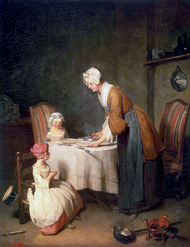 chardin- inaczej niż poprzedni – rodzajowość, zacisze domowe, spokój, martwe natury, nazywany francuskim cholendrem, ciche cnotliwe, mieszczańskie życie, trombe oil, rozmyte światło