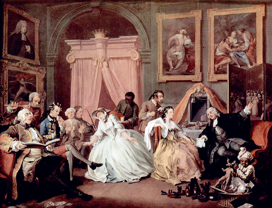 scena rodzajowa/ , sceny modnego małżeństwa, pokazywanie życia mieszczan, realizm z lekką kpiną, satyrą, postawy ludzi z lekkim życiem itp., rozluźnienie obyczajów, obrazy moralistyczne mające na celu piętnować re cechy