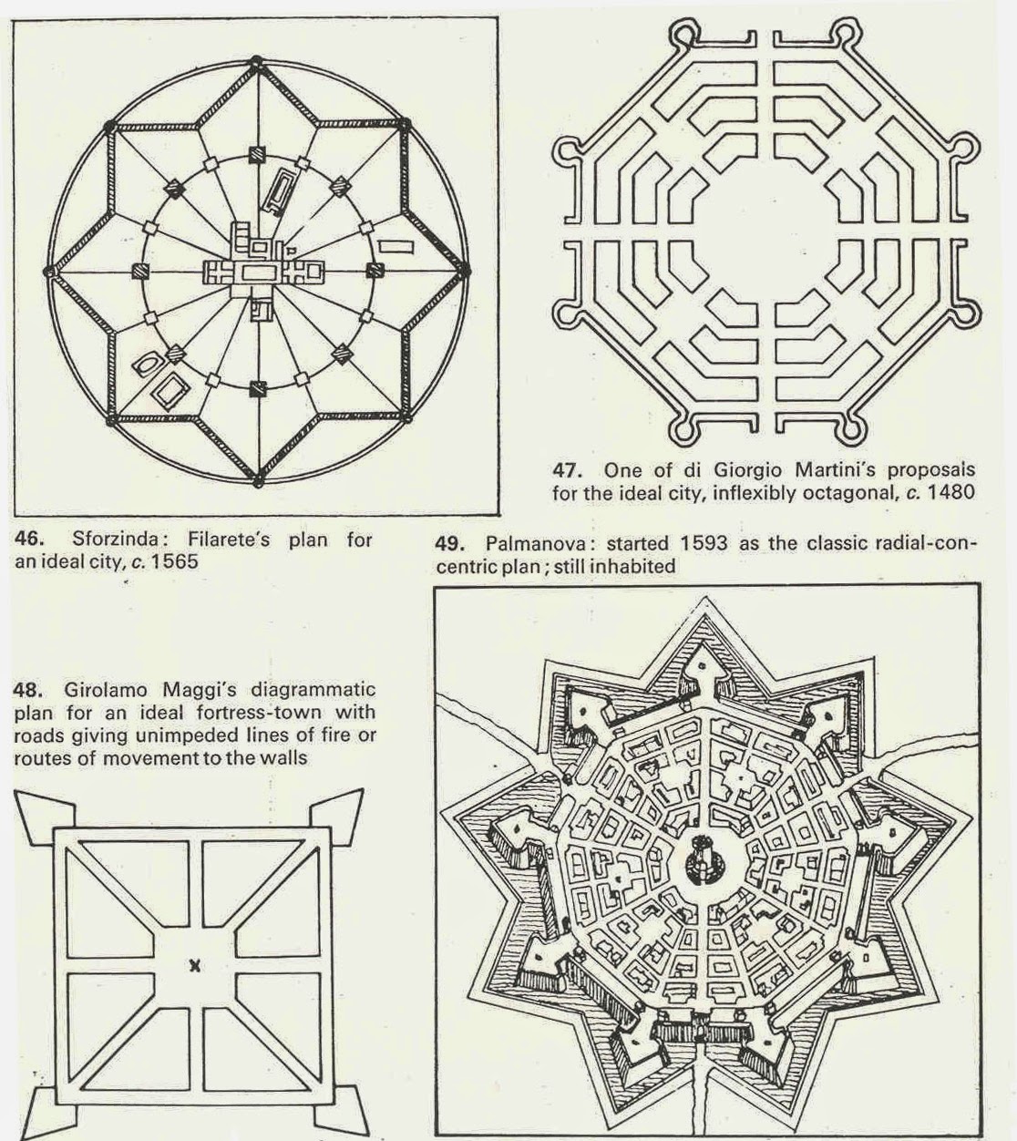 o trwałość, użyteczność, piękno o właściwa lokalizacja względem kierunków wiatrów – rzut 8 boczny o spełniało cele społeczne o jego teorie znalazł odzwierciedlenie w traktatach XVI w o założeniach urbanistycznych – określono użyteczność w obronności Idealne miasto renesansowe o nawiązanie do Witruwiusza o plany i projekty podporządkowane geometrii – koło, gwiazda, wielobok o regularność ulic promieniście ułożonych o reprezentuje idealny model przestrzenny w powiązaniu z idealnym modelem społecznym o Sforzinada – miasto idealne, plan miasta niezrealizowany dla księcia F. Sforzy, autorstwa Antonio Averulino zw. Filarete (1400-1464) plan wpisany w koło- 8 boczna gwiazda wierzchołki gwiazdy – baszty centrum – plac reprezentacyjny promieniście, radialnie ułożone ulice mniejsze place o charakterze utylitarnym - place handlowe