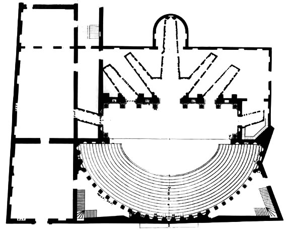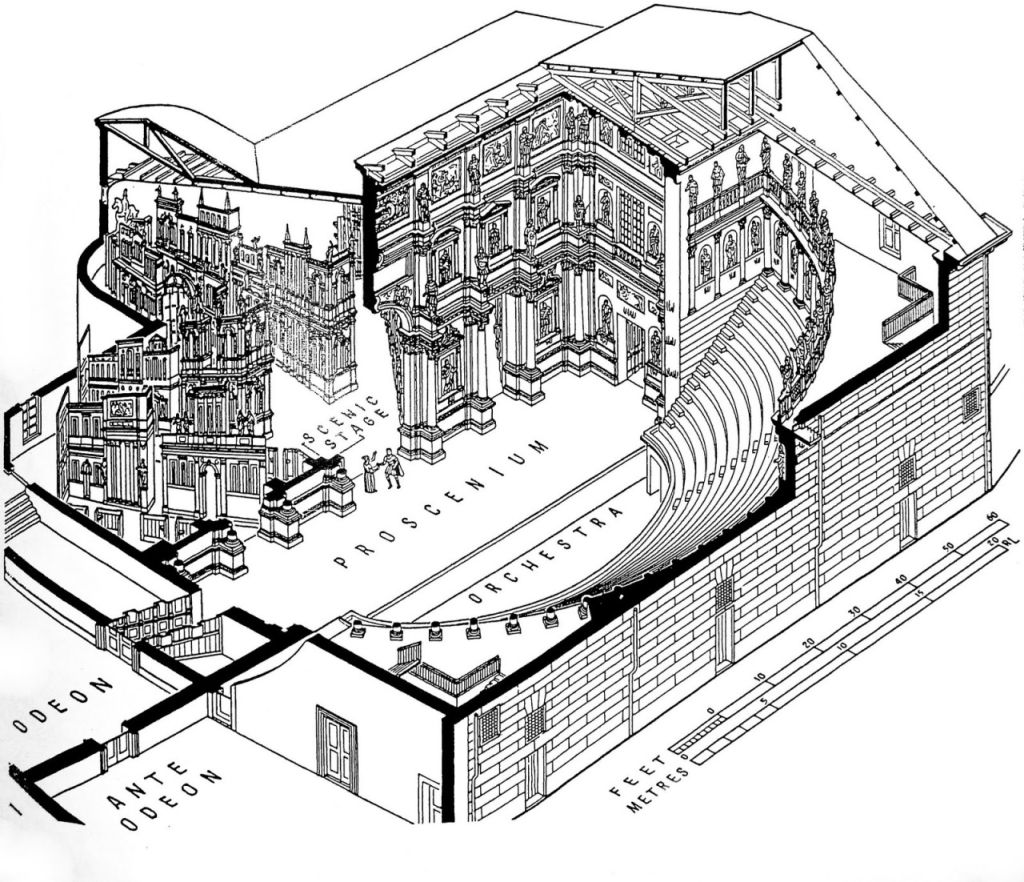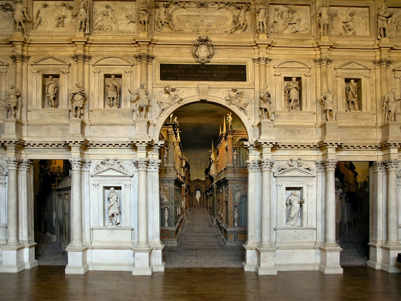 zaprojektował widownię na planie o kształcie półelipsy, zamiast półkolistego, który najczęściej miały teatry antyczne wysiłek twórczy skupił na wnętrzu obiektu, pomijając prawie całkowicie bryłę zewnętrzną, która wskazywałaby na przeznaczenie budynku i podkreślała jego specjalne funkcje realizuje antyczną rzymską zasadę stałej i bogato opracowanej dekoracji scenicznej, poprzedzonej sceną ogromne wyzwanie podczas budowy gmachu teatralnego w Vicenzy stanowiła jednak „perspektywiczna scenografia” - ulice antycznego miasta wydają się być nieskończenie długie i uciekać w bliżej nieokreśloną głębię, podczas gdy ich rzeczywista głębokość nie przekracza 12 m scenografia zakomponowana została na podobieństwo antycznego łuku triumfalnego ku czci Herkulesa, protoplasty starożytnych olimpiad, do których nawiązywała nazwa instytucji kulturowej Accademia Olimpica oraz samego teatru w Vicenzy. na szczególną uwagę w wyposażeniu wnętrza zasługują także statuy stiukowe, rozstawione w niszach parawanowej ściany poprzedzającej iluzjonistyczną scenografię był to obiekt, który będzie naśladowany, a jego forma w ciągu wieków rozwijana i udoskonalana przez następne pokolenia architektów w całej Europie