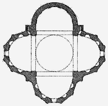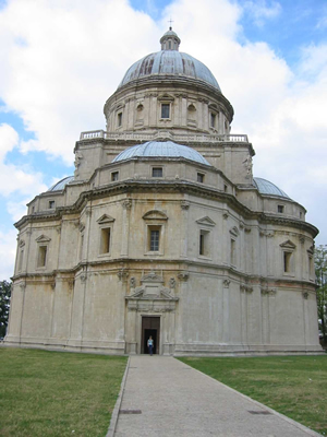 Oryginalny projekt przypisuje się Donato Bramantemu , pomimo braku dokumentacji. Cola da Caprarola , [1] podobno wspomagane przez Baldassare Peruzzi , [ potrzebne źródło ] rozpoczął budowę w 1508 roku na bok wzgórza miasta, tuż za murami. Projekt jest często błędnie przypisywany Bramantemu . [2] Ma grecki plan krzyża: trzy apsydy są wielokątne, a ta po stronie północnej jest półkolista. Inni architekci, którzy pomogli w ukończeniu pracy, to Antonio da Sangallo Młodszy , Galeazzo Alessi , Michele Sanmicheli ,Vignola i Ippolito Scalza . Kościół został ukończony dopiero w 1607 roku. Absydę wieńczy kwadratowy taras z czterema orłami na narożach, z którego wznosi się kopuła.
