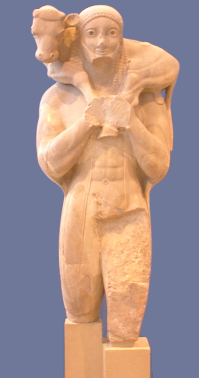 typ przedstawienia w starożytnej rzeźbie greckiej, który został wypracowany w okresie archaicznym. Moschoforos to mężczyzna niosący młodego byczka na ramionach. Ledwie dostrzegalny, rozchylony chiton ukazuje tors mężczyzny. Obie postacie tworzą zwartą całość, co podkreślone zostało układem rąk człowieka i nóg zwierzęcia. Zwarta kompozycja posągu akcentującego fizyczny i duchowy związek człowieka ze zwierzęciem ikonograficznie nawiązuje do schematu mykeńskiego. Rzeźba jest ponadnaturalnej wielkości co dodaje kompozycji metafizycznego monumentalizmu. Uderza także wyraz rozradowanej twarzy z wielkimi, okrągłymi oczami. Jest to przykład tzw. uśmiechu archaicznego.