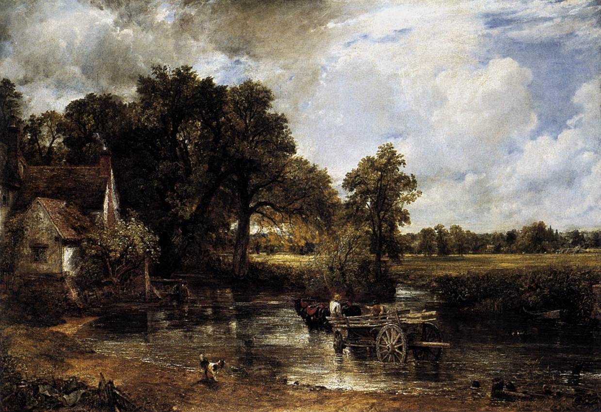 socyste zielenie, człowiek sztafaż, / W polskiej literaturze przedmiotu spotyka się też inne warianty tytułu - Wóz z sianem[2] (chociaż na przedstawionym na obrazie wozie nie ma siana) lub Bród[3]. Obraz przedstawia okolice Flatford Mill, młyna będącego własnością ojca Constable’a, położonego nad rzeką Stour, w hrabstwie Suffolk. Budynek na obrazie to istniejący do dziś dom sąsiada Constable’a - Willy’ego Lotta. Na pierwszym planie widać psa; chociaż jest on stosunkowo niewielki stanowi ważny element kompozycji - prowadzi oko widza do głównego motywu obrazu, wozu stojącego w wodzie, zaprzężonego w dwójkę czarnych koni. W oddali widać słabo widocznych ludzi pracujących przy sianie, zapewne tam jedzie wóz. Znaczne partie obrazu zajmują drzewa i wysokie kłębiaste chmury stanowiące charakterystyczną cechę tego regionu. Powstają one na skutek bliskości ujścia rzeki Stour[3]. Obraz powstawał przez kilka lat, artysta wykonał najpierw w plenerze wiele małych szkiców, a potem duży szkic wielkości przyszłego obrazu, na którym opracował kompozycję dzieła. Obraz miał być próbą stworzenia nowego tematu malarskiego, podniesieniem pejzażu do godności sztuki poważnej./ Constable- anglik, samodzielność pejzażu, 1776-1837, portrety dla zarobku, plener dosłowne przedstawienie przyrody