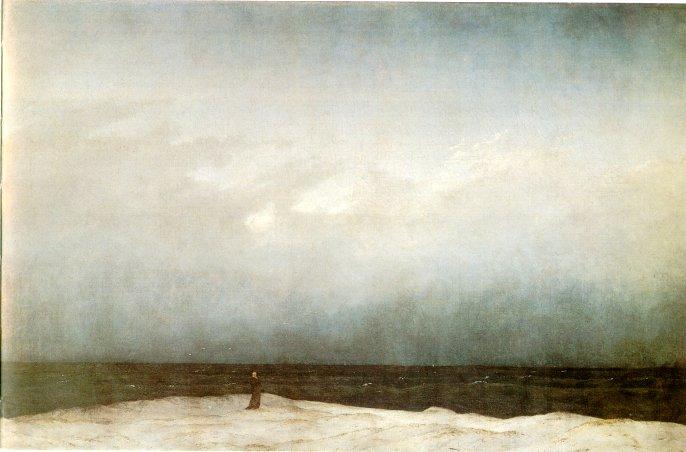Obraz ma orientację poziomą. Kompozycyjnie podzielony jest na trzy części: pas ziemi, morze i niebo. Brzegiem morza idzie mnich. Otaczają go latające nisko mewy. Morze jest ołowiano-czarne, a nad nim unosi się szara zasłona chmur. Tak przedstawiona przestrzeń stwarza wrażenie pustki