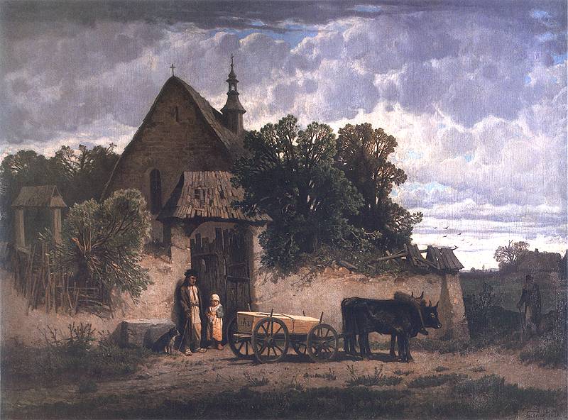 Przed bramą w zrujnowanym murze otaczającym wiejski kościółek stoi mężczyzna z dzieckiem. Obok na wozie, do którego zaprzężono parę wołów, leży trumna zbita z surowych desek. Biedna, chłopska rodzina straciła najprawdopodobniej żonę i matkę, dwojgu osamotnionych żałobników towarzyszy jedynie pies. Zza rozpadającego się muru wyłania się zarys starego kościoła, którego szczytowa ściana nosi cechy gotyckie. Obok widoczna jest wolnostojąca, drewniana dzwonnica. Otoczenie świątyni jest zaniedbane, mur się kruszy i sypie, wrastają w niego drzewa. Cmentarna brama ma już jedynie charakter symboliczny, bo została sklecona z nierównych i spróchniałych desek. Znaczną część płótna stanowi partia nieba pokrytego burzowymi chmurami. Całość jest ciemna i ponura, jedynie zabłąkany promień światła oświetla wóz z trumną i osoby stojące obok.