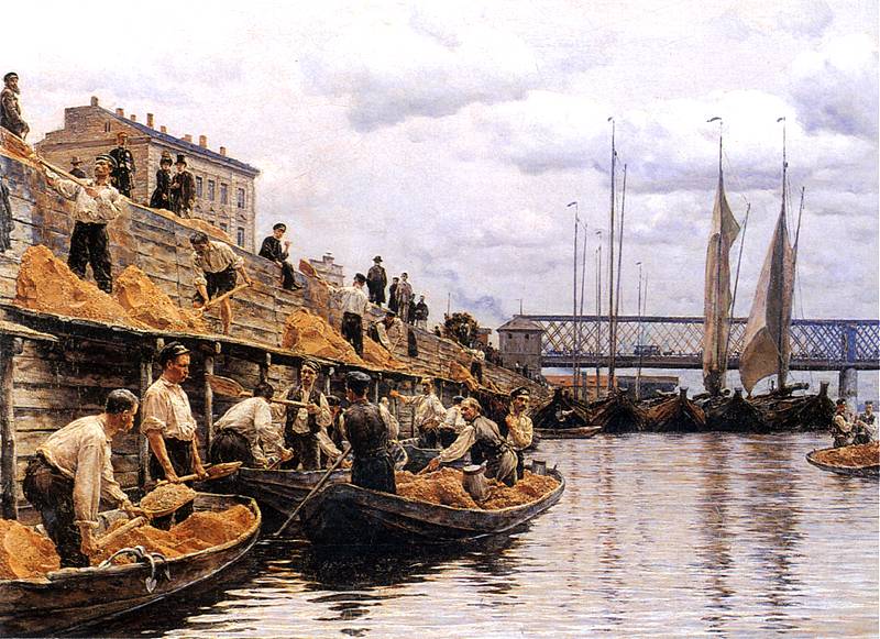 – dwie wersje/ Obraz przedstawia piaskarzy pracujących na brzegu Wisły, przerzucających piasek z łodzi na wysokie nabrzeże. Rytmicznie rozmieszczone po lewej stronie kadru postaci z łopatami ukazane są w różnych stadiach ruchu. Dzieło cechuje jednolita kolorystyka, w której dominują tony szaroniebieskie i ugry. Kompozycja jest asymetryczna i otwarta. Na dalszym planie perspektywę zamyka kilka barek i most Kierbedzia, co pozwala zlokalizować scenę na warszawskim Powiślu. Obniżony horyzont sprawia wrażenie, jakby widz obserwował scenę z poziomu lustra wody.