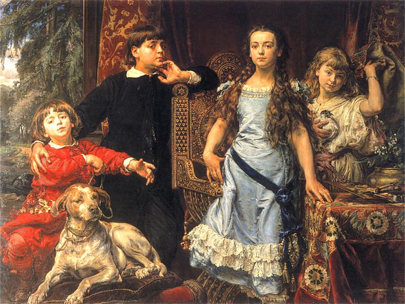 Portret trojga dzieci artysty: Tadeusza, Heleny i Beaty oraz czwórki dzieci. Jan Matejko – malarstwo historyczne, piętnujące biedotę i realizm historyczny, nauczyciel gotlieba, mofohera i kogoś tam, precyzyjny rysunek, studium rysunku do każdego dzieła