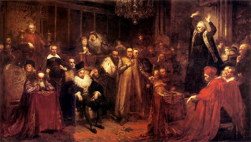 Główny bohater historii, Piotr Skarga, stoi po prawej stronie. Gest, który wykonuje, podkreślony jest jasnym światłem za nim, na jego dłoniach i twarzy, co stanowi wyraźny kontrast z ascetycznym ubraniem ożywionym jedynie żółtą stułą. Doniosły, górujący nad nieruchomym audytorium Skarga żywo gestykuluje. Matejko pokazuje różne reakcje słuchaczy na słowa kaznodziei. Od zasłuchania, zrozumienia, przejęcia po lekceważenie i roztargnienie, jakie widać na twarzy Zygmunta III Wazy, siedzącego niemal pośrodku, a uważanego za słabego króla. W centrum obrazu leży rękawica, nienależąca do żadnej z przedstawionych postaci. Jest to podwójne wyzwanie rzucone przez samego Matejkę, że to on będzie wielkim malarzem i nauczycielem swojego narodu. Rękawice interpretuje się także jako wyzwanie rzucone magnaterii. Przecież pośrodku stoją: Janusz Radziwiłł, Mikołaj Zebrzydowski i Stanisław Diabeł Stadnicki – połączeni udziałem w rokoszu przeciw królowi. Na obrazie widoczny jest również hetman Jan Zamoyski siedzący po lewej stronie na podwyższeniu. Po lewej stronie w dolnej części obrazu widzimy dwóch purpuratów: Hipacego Pocieja i biskupa Stanisława Karnkowskiego. Z prawej zaś są widoczne twarze dwóch posłów oraz kardynała Enrico Caetaniego. Za królem widzimy małego królewicza Władysława i marszałka wielkiego koronnego Mikołaja Wolskiego. U stóp Piotra Skargi siedzi Jan Piotr Sapieha. Matejko namalował obraz tuż po załamaniu powstania styczniowego, co jeszcze bardziej potęguje grozę nieruchomego, skamieniałego z przerażenia audytorium i ujętej bardzo dynamicznie, natchnionej postaci królewskiego spowiednika i kaznodziei. Michał Szweycer powstaniec listopadowy i towiańczyk, pozował do tego obrazu jako Piotr Skarga[potrzebny przypis]. Praca utrzymana jest w tonach fioletowo-czerwonych z dużą ilością purpury, co nadaje wrażenie dostojności przedstawienia.