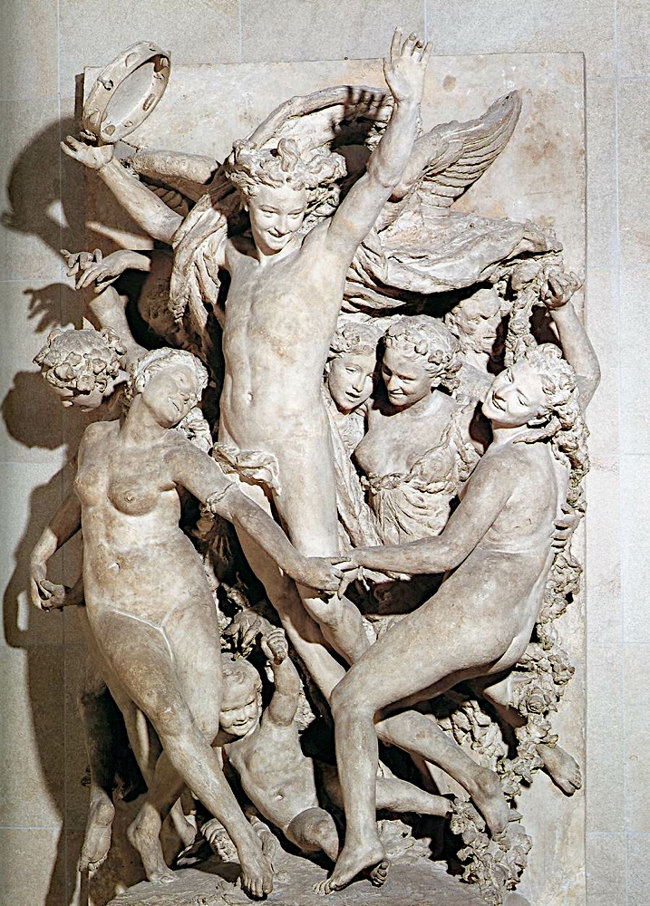 Taniec – NEOBAROKOWA, na szczycie opery paryskiej, motyw tańca, tematy muzyczne, młodzieniec wokół którego tańczą bachantki, pełna ekspresji, zróżnicowana faktura, budowana po skosach, część pełnoplastyczna a część wypukły relief, kontrastowy światłocień, inspirował się michałem aniołem