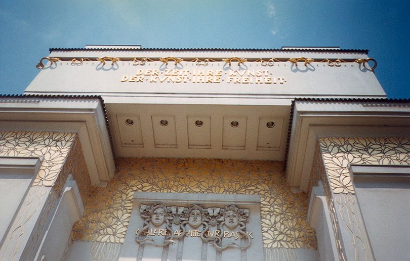 motywy roślinne, kula ażurowa, wyważona forma, kubiczna, gzymsy, / Budynek o geometrycznie prostej bryle stoi na betonowych filarach, których podstawy znajdują się osiem metrów pod ziemią w miejscu gdzie płynie podziemna rzeka Wien. Ta prostota w połączeniu z bielą fasad robi wrażenie pewnej elegancji. Ten geometryzm wiedeńskiej secesji jest również widoczny w detalach architektonicznych wykonach często z połączeń kamienia, szkła i metalu. Kopuła nawiązująca do znajdującej się po drugiej stronie placu Karlskirche nie jest jednak sklepieniem, lecz ażurową sferą utkaną z wyciętych z metalu liści wawrzynu (wykonanych z pozłacanego brązu). Pod kopułą znajduje się napis wykonany złotymi literami: Der Zeit ihre Kunst, der Kunst ihre Freiheit[1] stanowiący motto secesji[2]. Po lewej stronie drzwi wejściowych znajduje się drugie motto: Ver Sacrum (Święta Wiosna), które miało wyrażać nadzieję na nowy rozkwit artystyczny i było tytułem magazynu artystycznego stowarzyszenia. Brązowe drzwi wejściowe zostały wykonane przez Georga Klimta (brata Gustava) według projektu Olbrichta. Dwie mozaikowe misy obok schodów prowadzących do portalu wejściowego są autorstwa Roberta Oerleya. Sześć sów na dwóch fasadach bocznych zaprojektował Koloman Moser. Gorgony nad drzwiami frontowymi wykonano według projektu Othmara Schimkowitza. Po prawej stronie budynku znajduje się brązowa statua Marka Antoniusza autorstwa Arthura Strassera, która została pierwotnie stworzona na Międzynarodowe Targi Paryskie w 1900 roku.