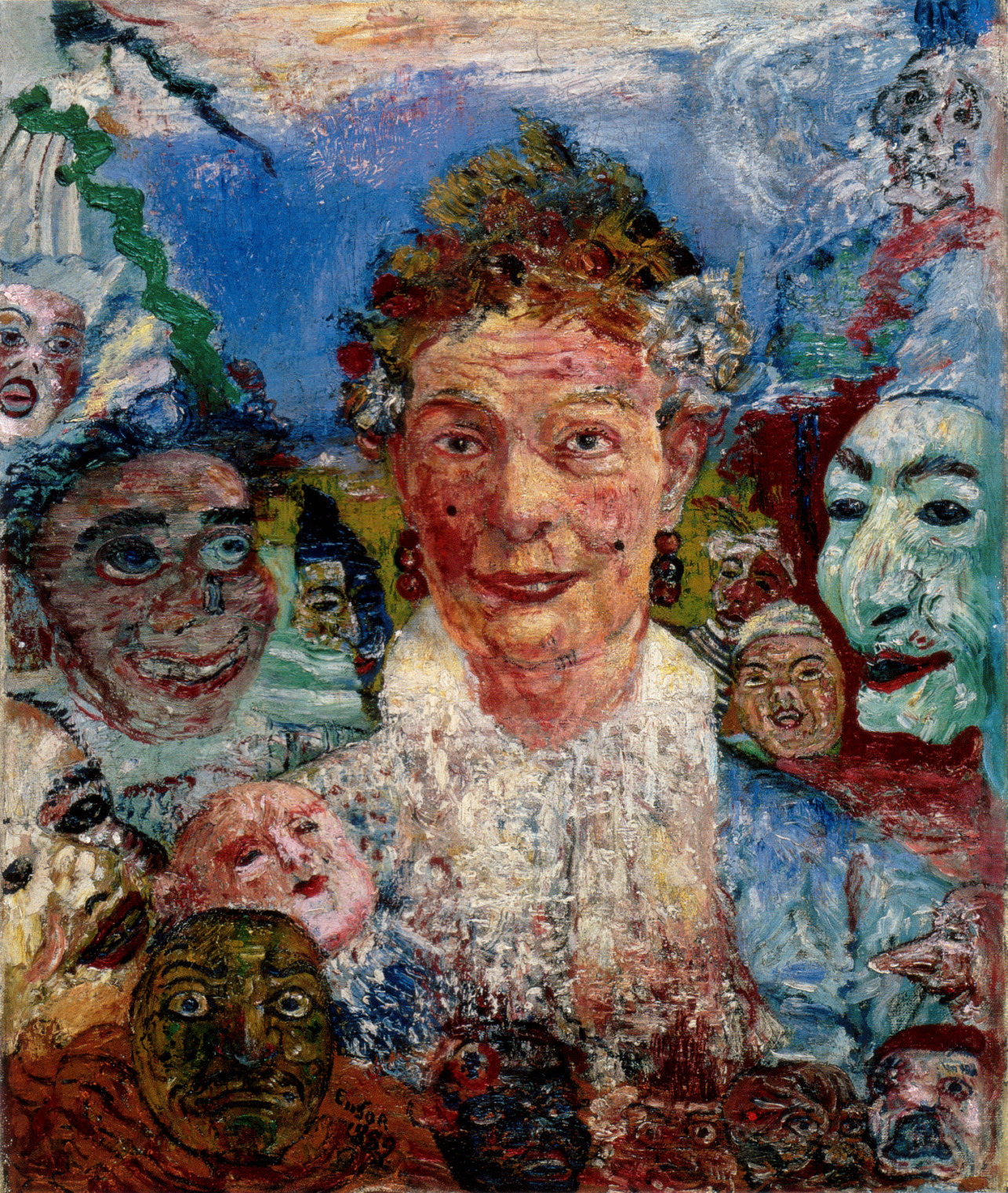 tytuły: pojedynek masek, maski patrzące na żółwia, autoportret wśród masek, maski skomfrontowane ze śmiercią, starsza pani z maskami, osobliwe maski/ James ensor – epspresjonista, motywy turpizmu, brzydoty, dekoracyjność