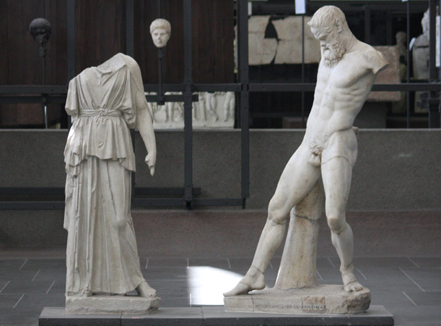 Stała na Akropolu ateńskim jeszcze przed jego odbudową przez Peryklesa. Zrekonstruowano ją na podstawie opisu Pauzaniasza, przedstawieniu na wazie i zachowanych kopii. Obie figury pokazano w ruchu, choć w bardzo różniący się sposób: Marsjasz jest dynamicznie odchylony do tyłu, Atena zaś wyprostowana, jedynie lekko zgina lewą nogę, jak gdyby odsuwała się od porzuconego fletu.