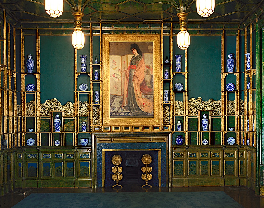 Pawia sala – podziały ścian, projektowanie całościowe, dekoracyjność, architektura przestrzeni/ W 1859 James Whistler przeniósł się z Paryża do Londynu, pozostał jednak nadal namiętnym klientem paryskich sklepów, sprzedających w latach 60. XIX w. japońskie i chińskie przedmioty. Artysta kolekcjonował biało-niebieską chińską porcelanę, a w jego przyszłych dziełach miały się zaznaczyć wpływy sztuki chińskiej i japońskiej. Widoczne były one w takich elementach kompozycyjnych jego obrazów jak: parawany, wachlarze, stroje postaci czy ceramika/ Pawi Pokój był początkowo pokojem jadalnym w londyńskim domu Leylanda. W pokoju znajdowała się cenna kolekcja chińskiej porcelany (która stała się pretekstem do tytułu obrazu Whistlera). Wystrój wnętrza zaprojektował architekt Thomas Jeckyll. Aby ukazać w sposób atrakcyjny kolekcję Leylanda Jeckyll skonstruował zestaw misternie rzeźbionych półek, a na ścianach zawiesił zabytkową, pozłacaną skórę[5]. Gdy Leyland stał się właścicielem Księżniczki, obraz zajął eksponowane miejsce nad kominkiem.