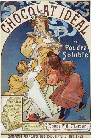 Plakat reklamowy czekolady Cała seria pór roku – alegorii dotyczących pór roku, miesięcy, dominuje płynna linia, płaskość, żywa kolorystyka, graficzność, motywy roślinne, zwierzęce, stylizowane Alfons Mucha – czeska secesja, kobiety namalowane w tylu belle epoque, projektant, plakaty reklamowe, karty dań, okładki do książek, typografia, alegoria, kompozycje symetryczne i asymetryczne