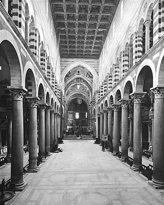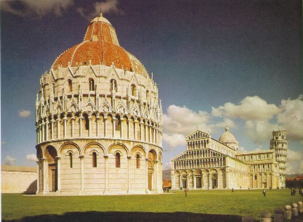 BAZYLIKA + KAMPANILA (dzwonnica kościelna charakterystyczna dla architektury włoskiej, wyodrębniona z bryły kościoła i budowana obok niej) + BABTYSTERIUM półkolumny, ślepe arkady, arkady, kopuła w kształcie elipsy, inkrustacja ( technika zdobienia przedmiotów: sprzętów, mebli, dzieł artystycznych itp., polegająca na wykonywaniu wgłębień w podłożu i wklejaniu w nie odpowiednio przyciętych płytek z różnych materiałów, np. drewna, kości słoniowej, metalu, masy perłowej, kolorowych kamieni, złota itp.)