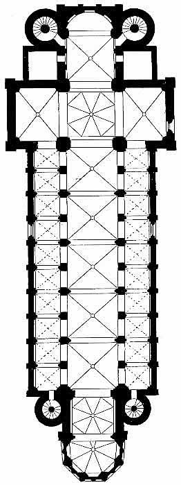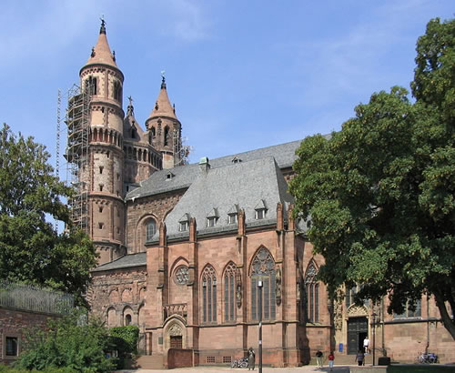Katedra wormacka jest dwuchórową bazyliką z transeptem od strony wschodniej, oraz kilkoma kaplicami przy nawach bocznych oraz przy wschodnim chórze. Korpus nawowy posiada system wiązany, w którym ośmiu przęsłom w nawach bocznych odpowiadają cztery przęsła w nawie głównej. Ramiona transeptu i oba chóry mają po jednym przęśle, przy czym obydwa chóry zamknięte są wielobocznymi absydami (absyda chóru wschodniego jest wpisana w prostokąt, na zewnątrz zarys absydy nie jest widoczny). Na skrzyżowaniu naw oraz ponad przęsłem zachodniego chóru wznoszą się kopuły o oktogonalnych bębnach, które na zewnątrz w formie przypominają wieże.