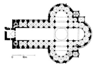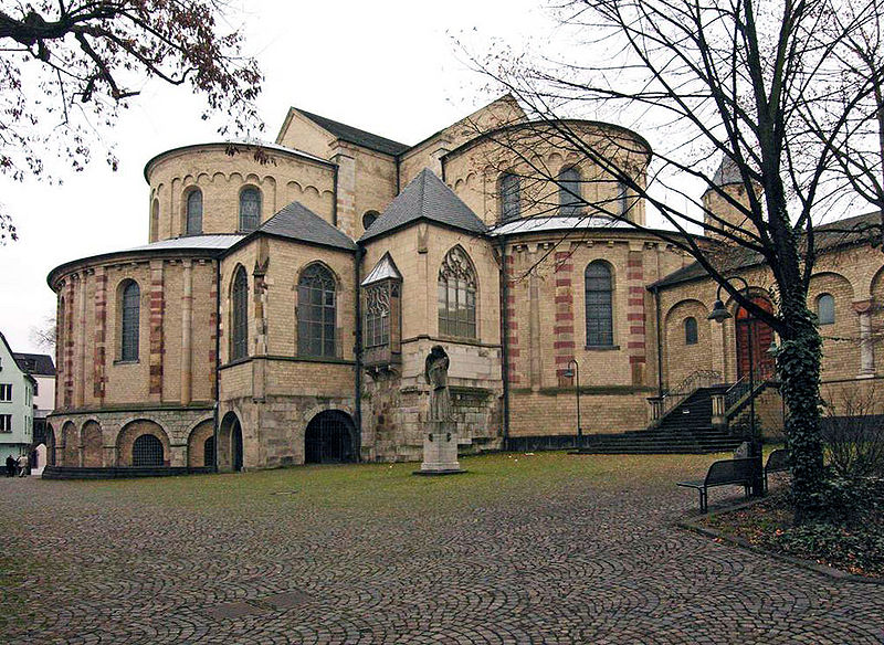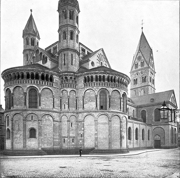 Świątynia została wybudowana na miejscu dawnej świątyni rzymskiej z ok. roku 50. naszej ery. Zbudowany na planie treflowym (odmiana planu krzyża z zaokrąglonymi trzema ramionami), kościół NMP na Kapitolu jest trójnawową bazyliką z monumentalnym trójkonchowym chórem. Nawy boczne są zintegrowane z jednolitym obejściem obiegający każde z trzech półkoli chóru. Występują jednakże różnice pomiędzy architektura części prezbiterialnej i nawowej. W korpusie nawowym filary międzynawowe są przysadziste, prostokątne w planie, podczas gdy filary prezbiterium są na planie okrągłym.