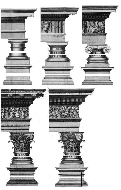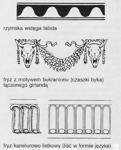 - Porządek toskański: Przyjęty od Etrusków, wykształcił się z porządku doryckiego. Wysokość kolumn wynosi do 14 modułów, czyli jest to porządek smuklejszy od pierwszych proporcji najmasywniejszego porządku greckiego. Trzon ma zazwyczaj powierzchnię gładką bez kanelowania. - Porządek kompozytowy: Trzon ustawiony jest na bazie. Jest gładki lub kanelowany, przy czym często kanelowanie obejmuje tylko 2/3 wysokości trzonu. Głowica ma charakter wybitnie dekoracyjny. Składa się z elementów występujących w kapitelach porządku jońskiego i korynckiego. Górna część głowicy jest uformowana z przekątnie ustawionych wolut, z kolei dolna posiada wyraźnie wyprofilowane liście akantu. - rzymsko dorycki: smuklejszy jedynie od doryckiego - stosowany w czasach rzymskich (rzymsko-joński i rzymsko-koryncki), w zasadzie nie odbiega od hellenistycznych wzorów; posiada jedynie bogatszą dekoracyjność detali. - motywy akantu i bukranionu