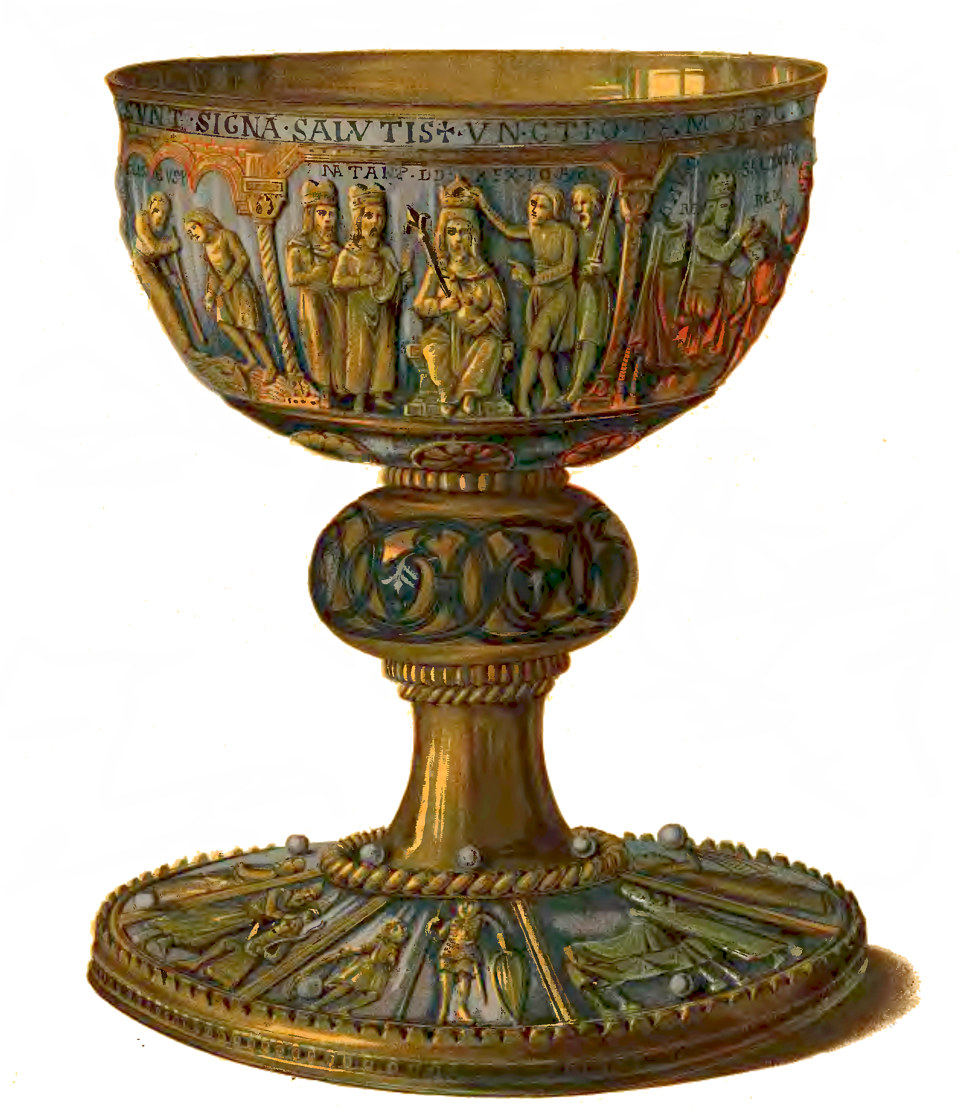 - 2 poł XII wieku - technika repusowania: można zdobić metale ciągliwe i kowalne - głównie złoto, srebro, miedź, mosiądz, żelazo. Używane są młotki - twarde, miękkie i cyzelerskie, punce oraz kowadła miękkie. Kowadło takie musi być wykonane z materiału, który ustępuje pod naciskiem (np. smoły, miękkiego drewna, ołowiu). - Na brzegu czaszy niellowany napis