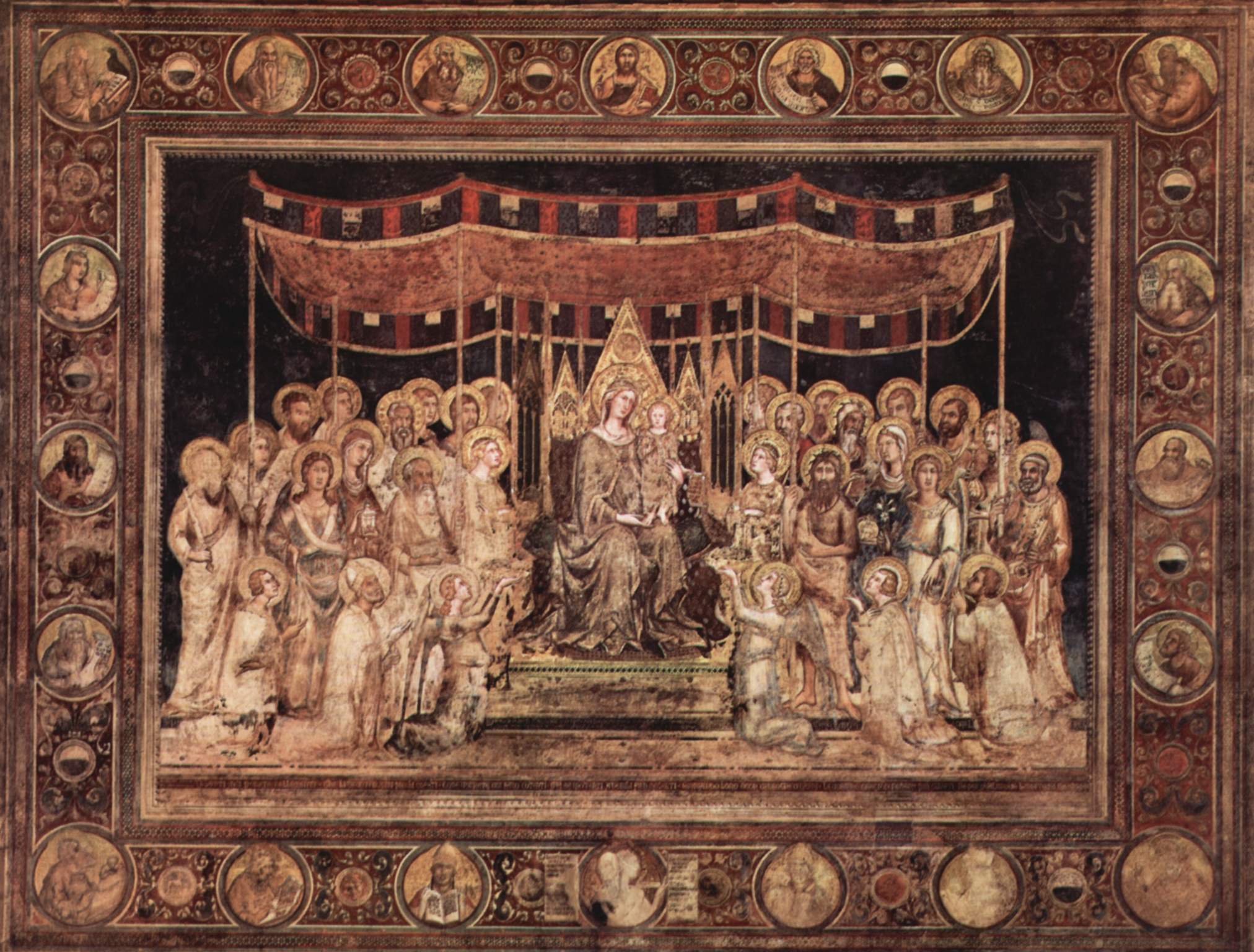 -malowanie na suchym tynku -1315r - Nad całością unosi się duży baldachim, którego słupy podtrzymują sami święci - Cały fresk jest ozdobiony prawdziwymi kamieniami i szkiełkami, które wibrują światłem. - Dookoła sceny Martini namalował iluzjonistyczną ramę z dwudziestoma okulusami, w których znajdują się postaci ewangelistów, doktorów Kościoła i proroków. - wzorowane na maeście Duccia