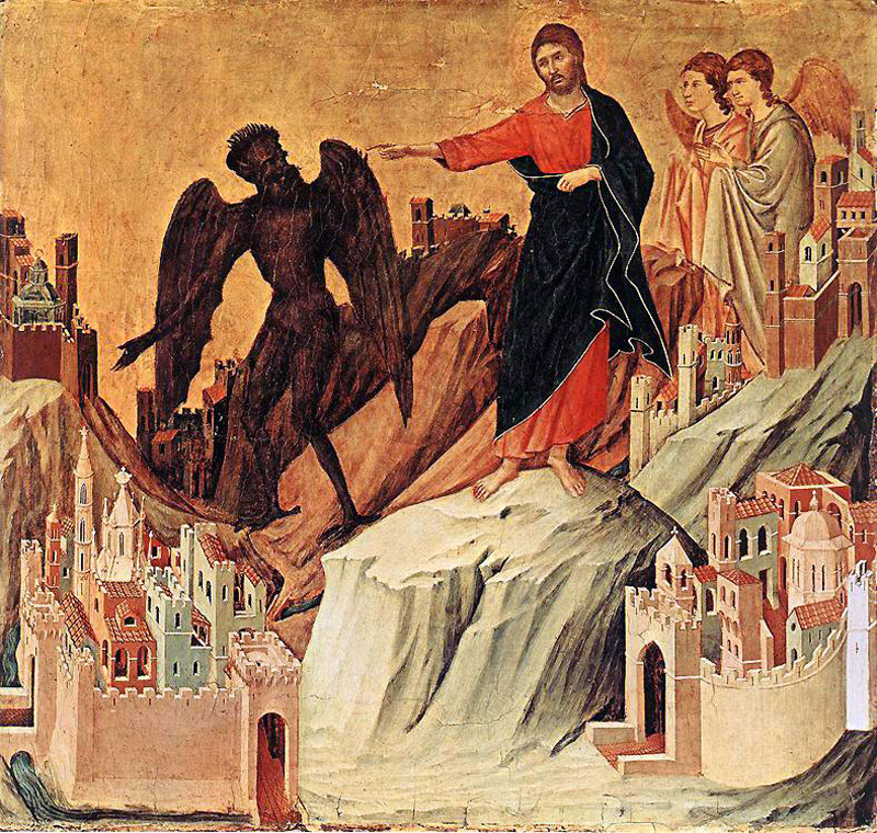 - Kuszeniu Jezusa wierność opowiadaniu biblijnemu przeplata się z realiami Italii z przełomu XIII i XIV wieku. Czerwień szaty Chrystusa wskazuje na Jego bóstwo i królewską godność zarazem, niebieski płaszcz, który ją okrywa, świadczy, że niemal całe niebo sprzysięgło się przeciw szatanowi i wspiera Syna Bożego pokonującego diabła. - Szatan rzeczywiście przedstawiony jest jako anioł, z dużymi skrzydłami; anioł jednak upadły, o czym świadczy czerń użyta do przedstawienia postaci. Za do dwaj aniołowie stojący z Chrystusem to typowo niebiańskie stworzenia: łagodna, aczkolwiek wyraźna kolorystyka, harmonijne proporcje ciała, układna postawa i skupione oczy. Otaczające skały zamki symbolizować mają wszystkie królestwa świata. - tempera na desce, 1308–1311, Frick Collection, Nowy Jork