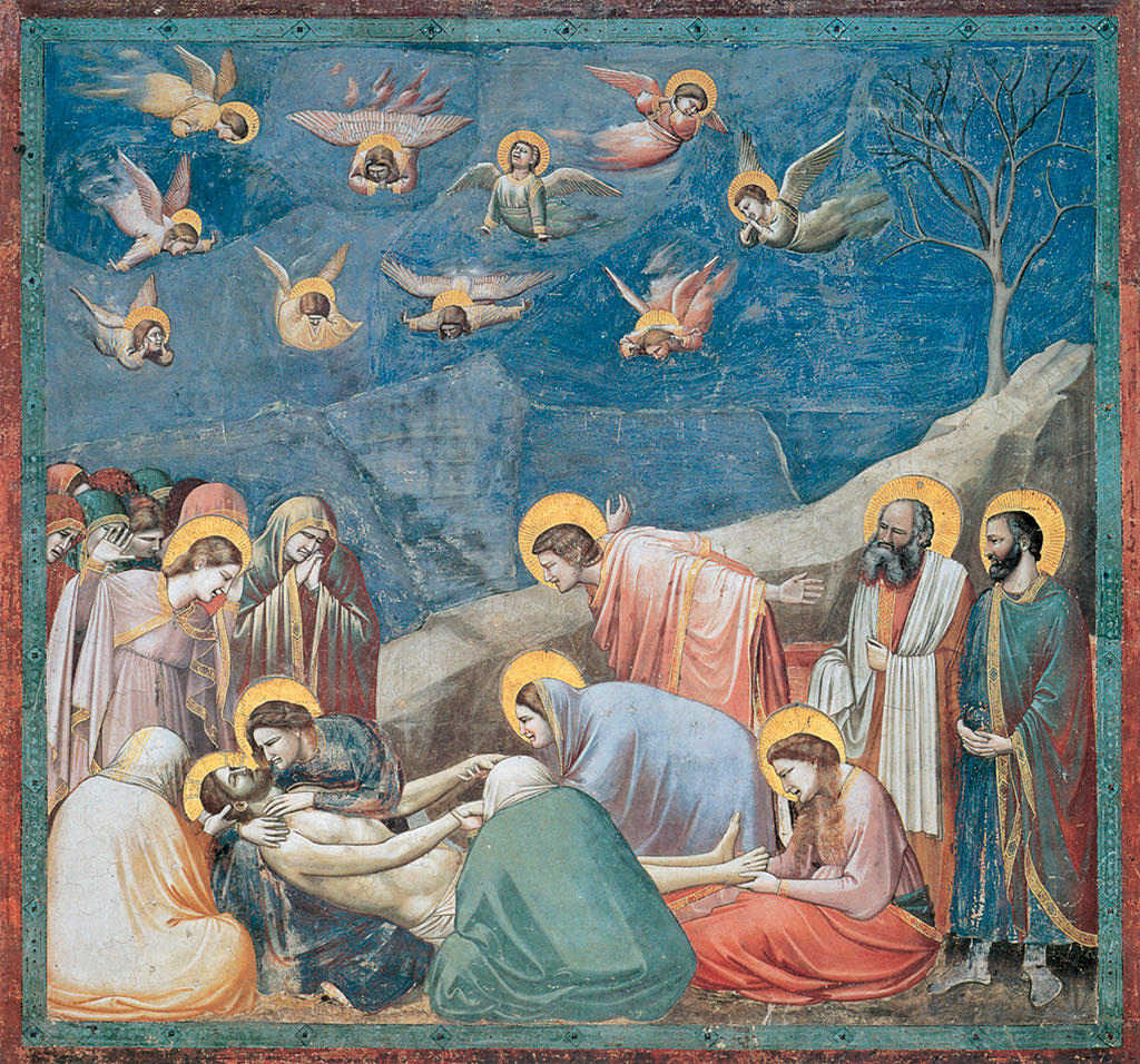 - fresk z kaplicy Scrovegnich fresk kończący wydarzenia o nadał wydarzeniu człowieczy wyraz, wzruszający i poruszający wyraz o w kompozycji 3 plany o na 1 planie postacie siedzące, otaczające zmarłe ciało Chrystusa - w dole postacie Matki Boskiej o Marii Magdaleny pokazane w rozpaczy – linie do dołu o w górnej części aniołowie – linie do góry o pomiędzy tymi grupami linia grzbietu skalnego opadająca w dół lewego rogu obrazu, przecina przestrzeń, w dali ledwo zarysowane linie wzgórz o punkt kulminacyjny malowidła znajduje się w lewym dolnym rogu – tam kierują silenie kompozycyjne, gesty i spojrzenia bohaterów o syntetyczna plastyka form postaci o każda postać w tej grupie ma swoją charakterystykę przez mimikę , gesty, pozy ciał i kolorystykę – Matka Boska (przyciska ciało Chrystusa), Maria Magdalena (pokornie podtrzymuje stopy Chrystusa), św. Jan ( rozpaczliwie rozwiera ramiona), Nikodem i Józef z Arymatei ( stoją milczący) o krążący aniołowie też uczestniczą w cierpieniu, smutku i lamentach o grupa jest odizolowana od świata skalistym pasem o krajobraz złożony jest z brył, naga przyroda, skały, bezlistne drzewo i kobaltowe świetliste niebo