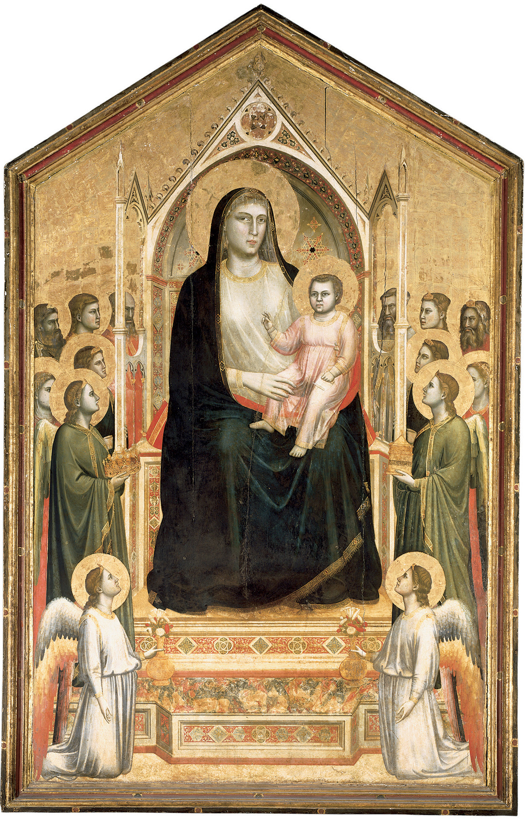 dla kościoła Ognissanti we Florencji kompozycja zamknięta w polu prostokąta z trójkątnym zakończeniem tron przedstawiony w surowej architekturze, otacza swą konstrukcją Marię i Jezusa, oddziela od złotego tła postacie wymodelowane światłocieniem dają wrażenie masywności – szczególnie Maria, której ciało wymodelowane jest przez szatę i światłocień przestrzeń malarska przekonywująca perspektywa odwrócona i początki zbieżnej - tron aniołowie otaczający tron Marii nakładają się na siebie, dają wrażenie 4 planów głębi Maria jest poważna, patrzy na widza - maesta