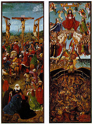 -ok. 1430 - płótno (przeniesione z panelu) -Na ramie dyptyku znajdują się cytaty biblijne pochodzące z Apokalipsy Jana z wizją Sądu Ostatecznego: I morze wydało zmarłych, co w nim byli, i Śmierć, i Otchłań wydały zmarłych, co w nich byli, i każdy został osądzony według swoich czynów (Ap 20:13). - Pod belką krzyża złoczyńcy ukrzyżowanego po lewej stronie Jezusa artysta uwiecznił Księżyc w fazie ubywania, między pełnią a ostatnią kwadrą. Jest to pierwsze w sztuce europejskiej w pełni realistyczne przedstawienie ziemskiego satelity, z wyraźnym odwzorowaniem mórz księżycowych